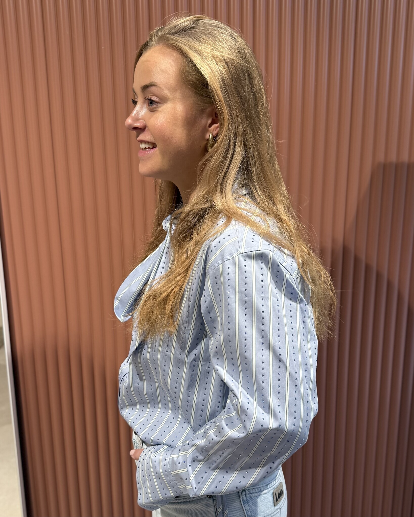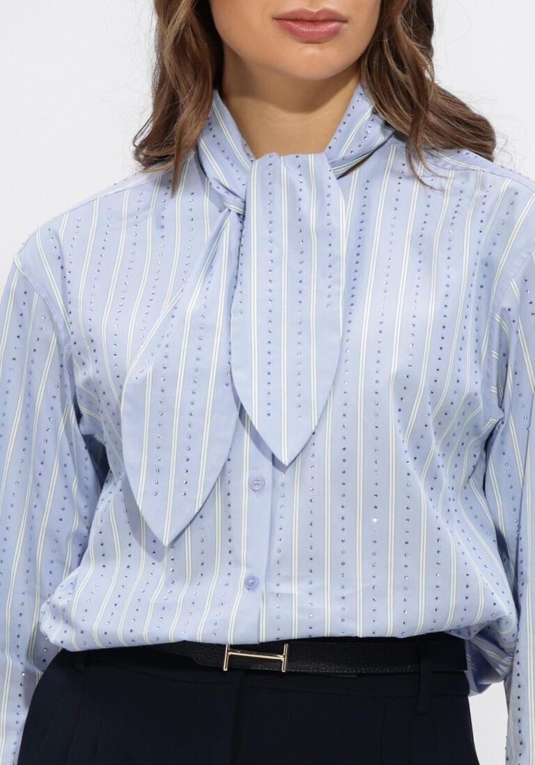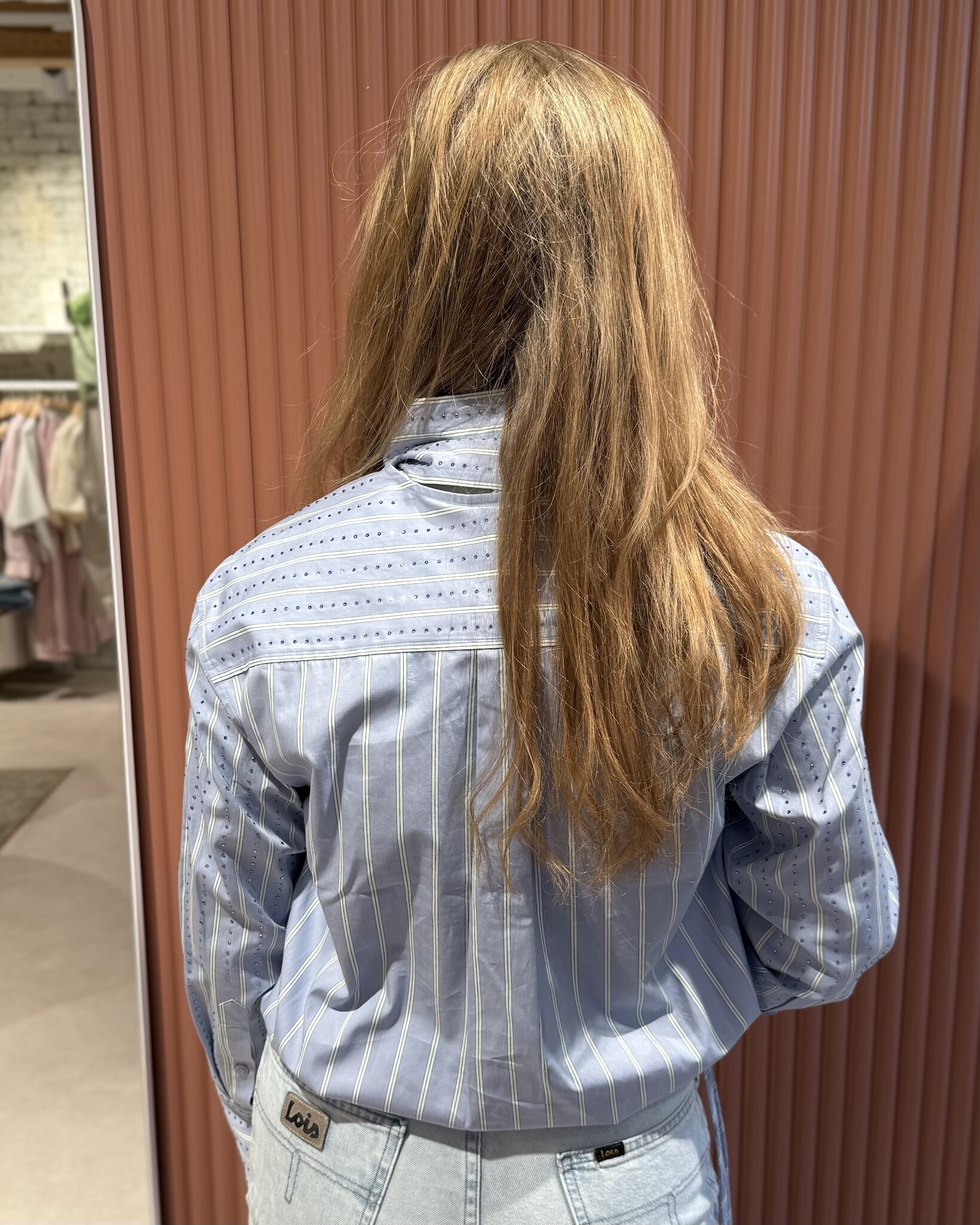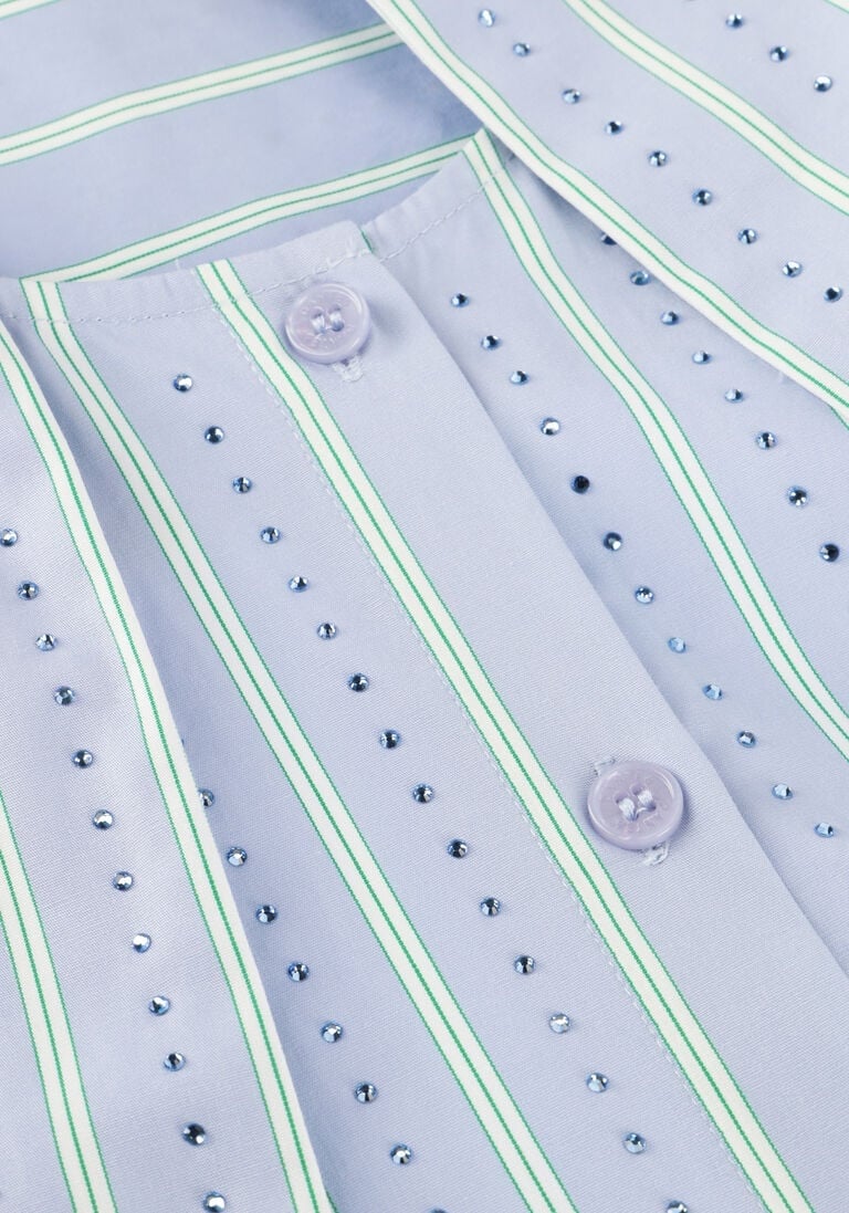 De Anubi Stripe Shirt van Dante6 in de kleur Blue Mist is een lichtblauwe gestreepte blouse en een moderne interpretatie van het klassieke streepdesign. De blouse is gemaakt van 100% biologisch katoen en afgewerkt met fonkelende strass-strepen voor een subtiel glanzend effect. De cropped pasvorm heeft een verstelbaar trekkoord in de zoom en een afneembare sjaalkraag die elegant gestrikt kan worden. De ronde hals met knoopsluiting en lange mouwen met knoopmanchetten maken het ontwerp compleet.