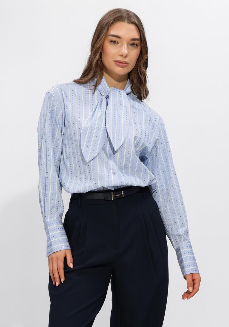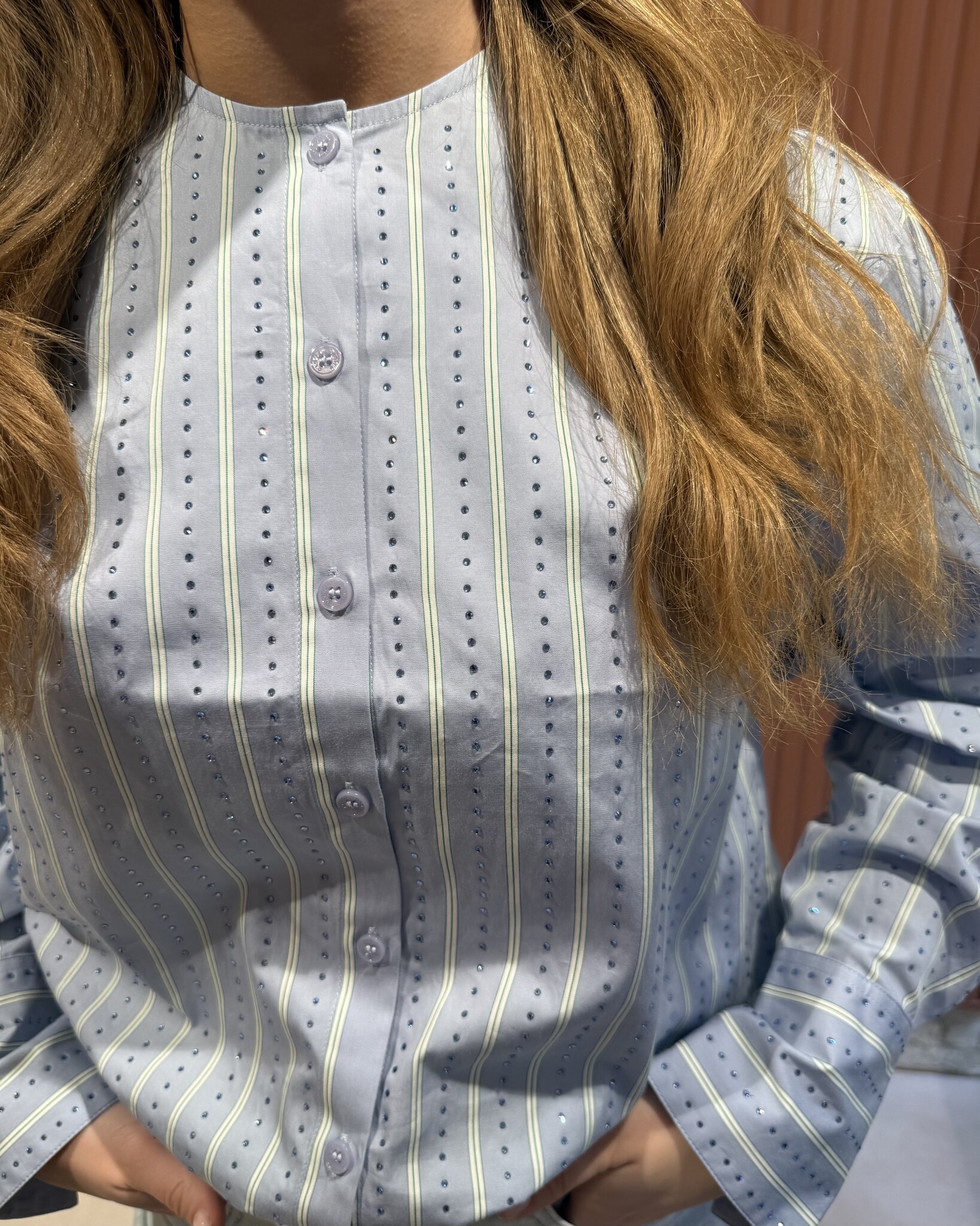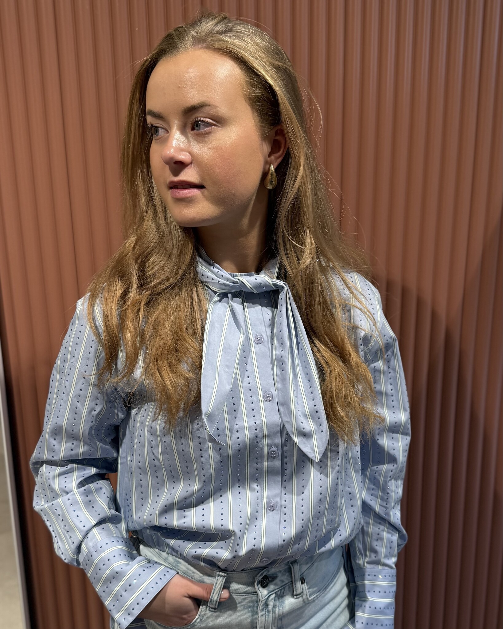 De Anubi Stripe Shirt van Dante6 in de kleur Blue Mist is een lichtblauwe gestreepte blouse en een moderne interpretatie van het klassieke streepdesign. De blouse is gemaakt van 100% biologisch katoen en afgewerkt met fonkelende strass-strepen voor een subtiel glanzend effect. De cropped pasvorm heeft een verstelbaar trekkoord in de zoom en een afneembare sjaalkraag die elegant gestrikt kan worden. De ronde hals met knoopsluiting en lange mouwen met knoopmanchetten maken het ontwerp compleet.
