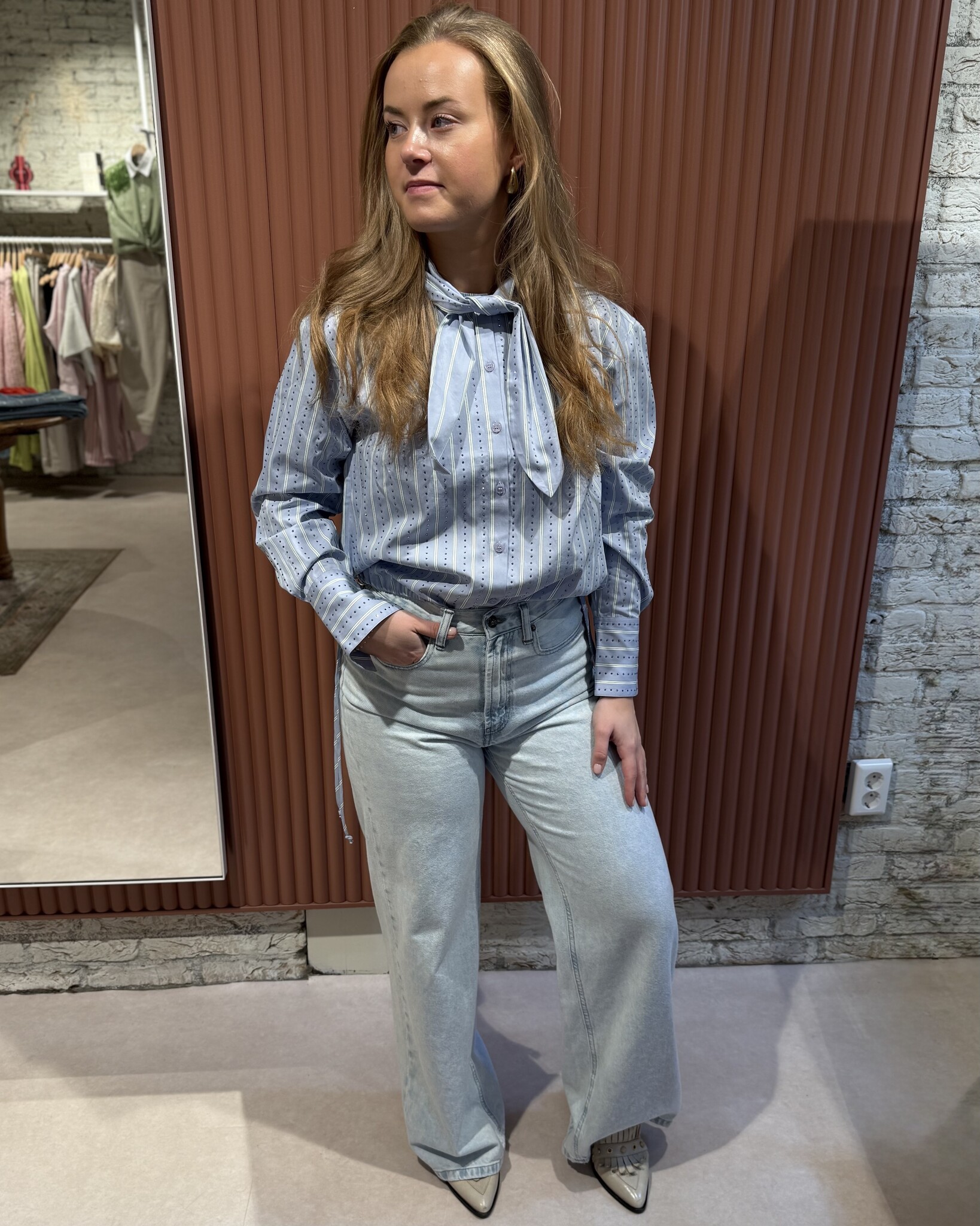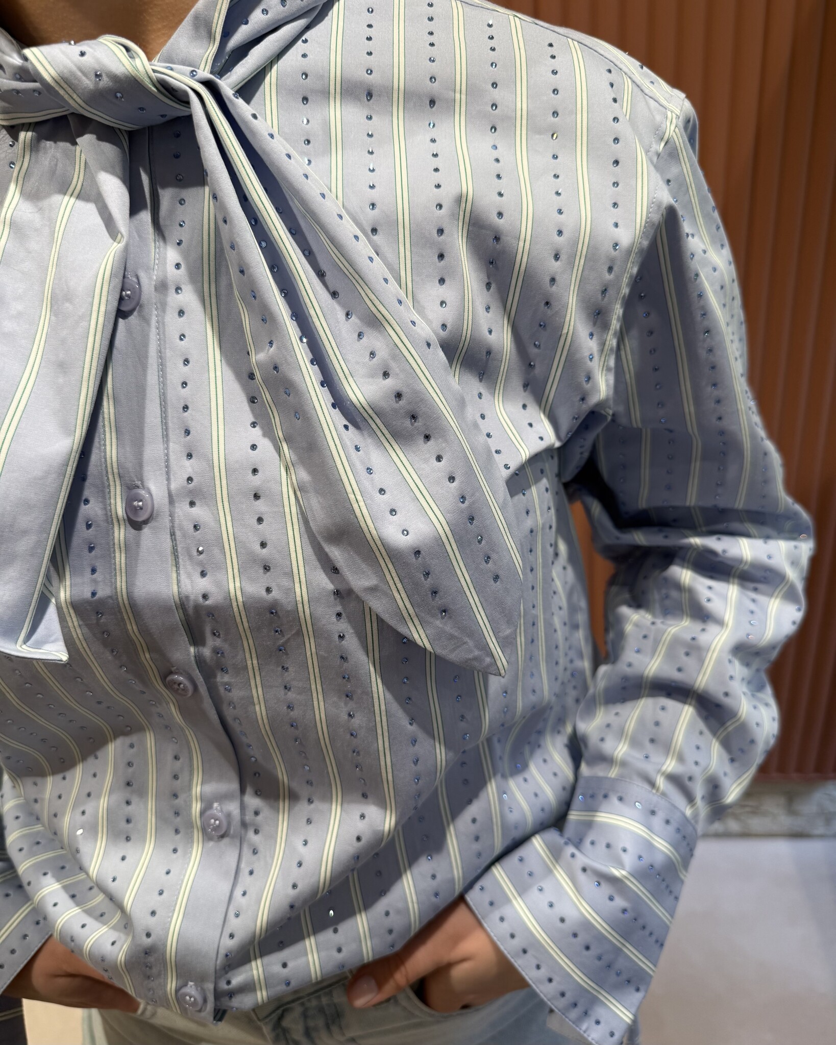 De Anubi Stripe Shirt van Dante6 in Blue Mist is een lichtblauwe gestreepte blouse van biologisch katoen met fonkelende strass-details. De cropped pasvorm, afneembare sjaalkraag en verstelbaar trekkoord geven een moderne twist.
