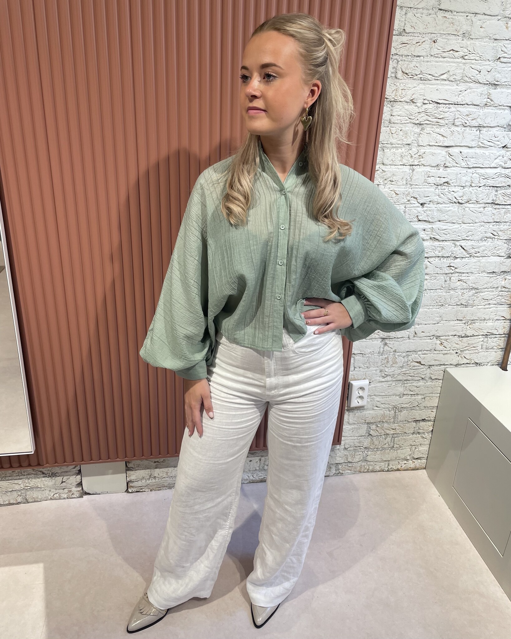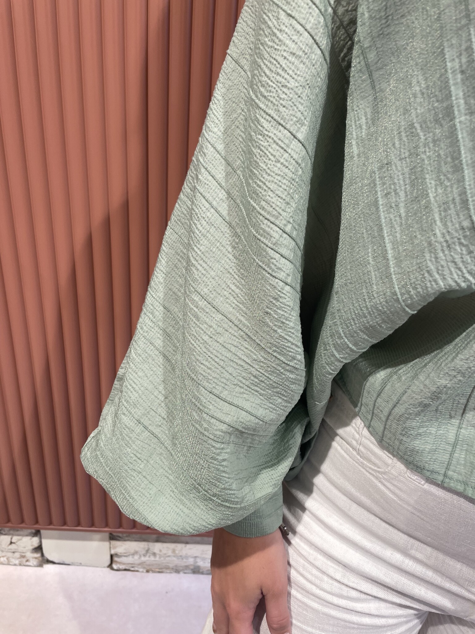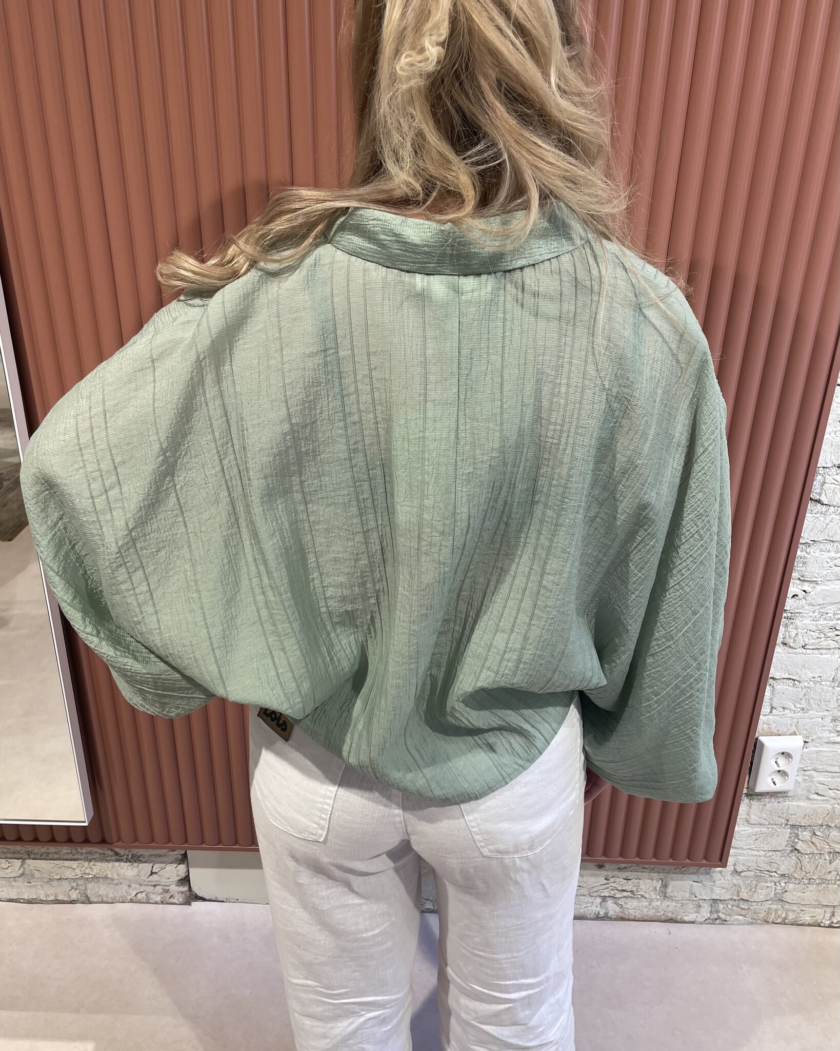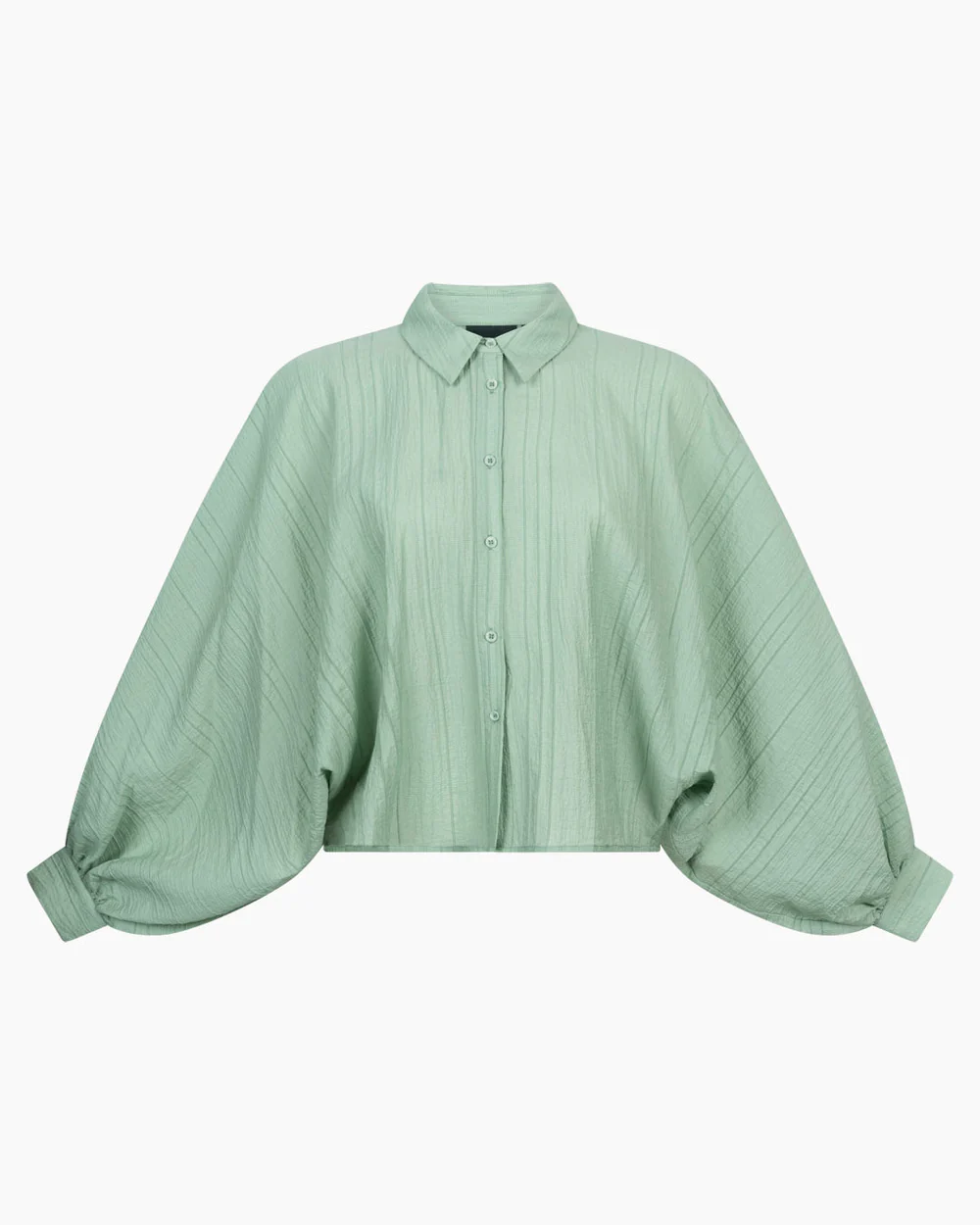 Het Bobby Shirt in de kleur Jadeite van Another-Label heeft een oversized ballonpasvorm met makkelijke aangeknipte mouwen voor een ontspannen, vloeiend silhouet. De diagonale streepstructuur voegt textuur en visueel belang toe. Dit shirt is gemaakt van een mix van lyocell-katoen en is zacht, ademend en milieuvriendelijk. Het bevat meer dan 50% lyocell, een natuurlijke, door de mens gemaakte vezel die is geproduceerd zonder giftige chemicaliën. Perfect voor zowel comfort als stijl.
