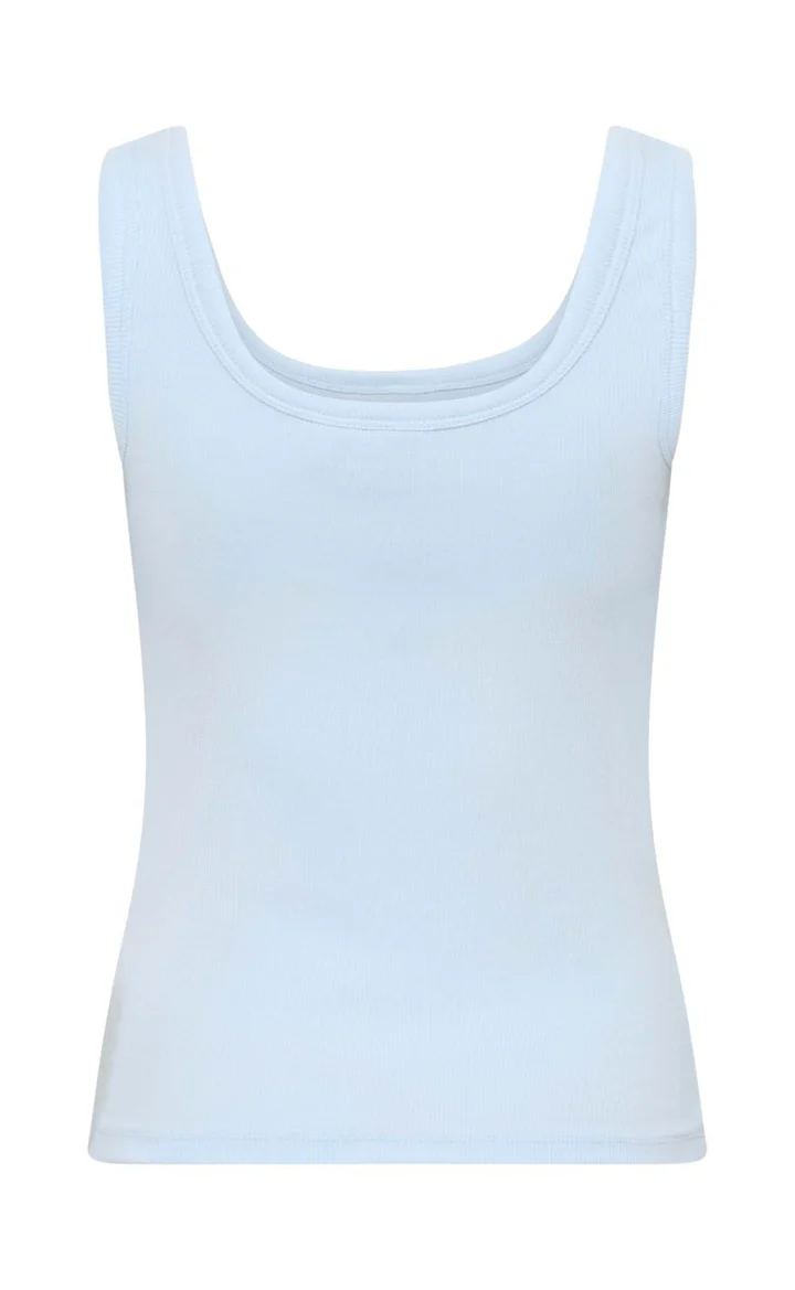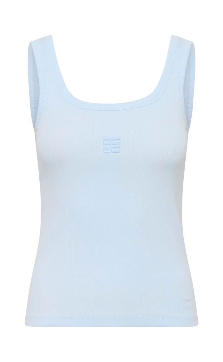 De Drew Logo Top 2.0 van Gestuz in de kleur Blue Finch is een lichtblauwe slim-fit damestop met hoge halslijn en mouwloos design. De geribde stof en het subtiel geborduurde logo zorgen voor een minimalistisch silhouet met moderne uitstraling. Dankzij de aangesloten pasvorm is de top comfortabel en veelzijdig te combineren.