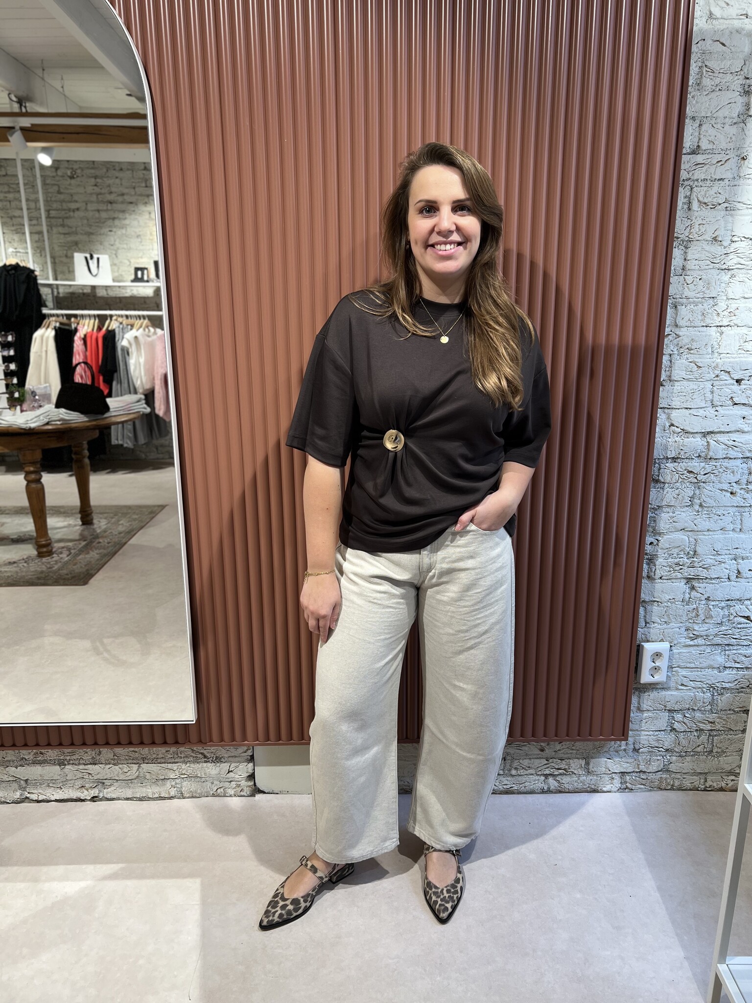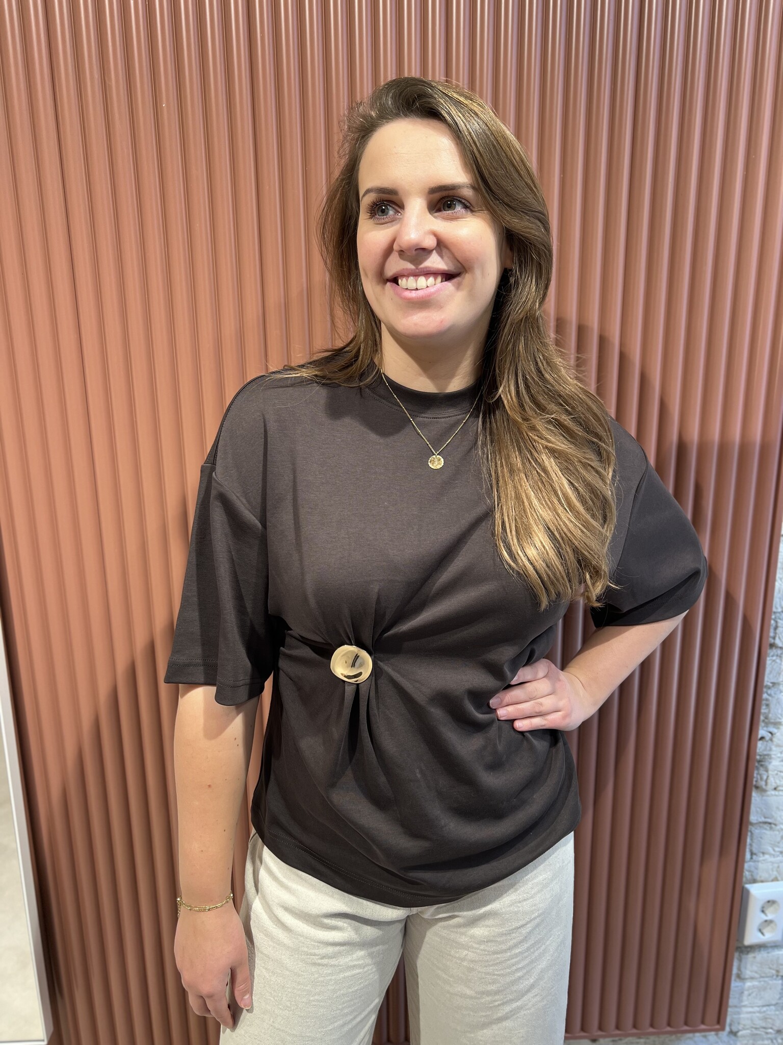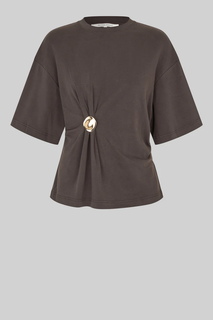 De Enora Brooch Tee van Second Female in de kleur Chocolate Torte is een chocoladebruine regular-fit damestop van een zachte en rekbare lyocell-cotton blend. De top heeft een ronde hals, korte mouwen en dropped shoulders voor comfortabel draaggemak. Een subtiel plooidetail aan één zijde wordt geaccentueerd met een afneembare gouden broche, waardoor de top een elegante en veelzijdige touch krijgt.