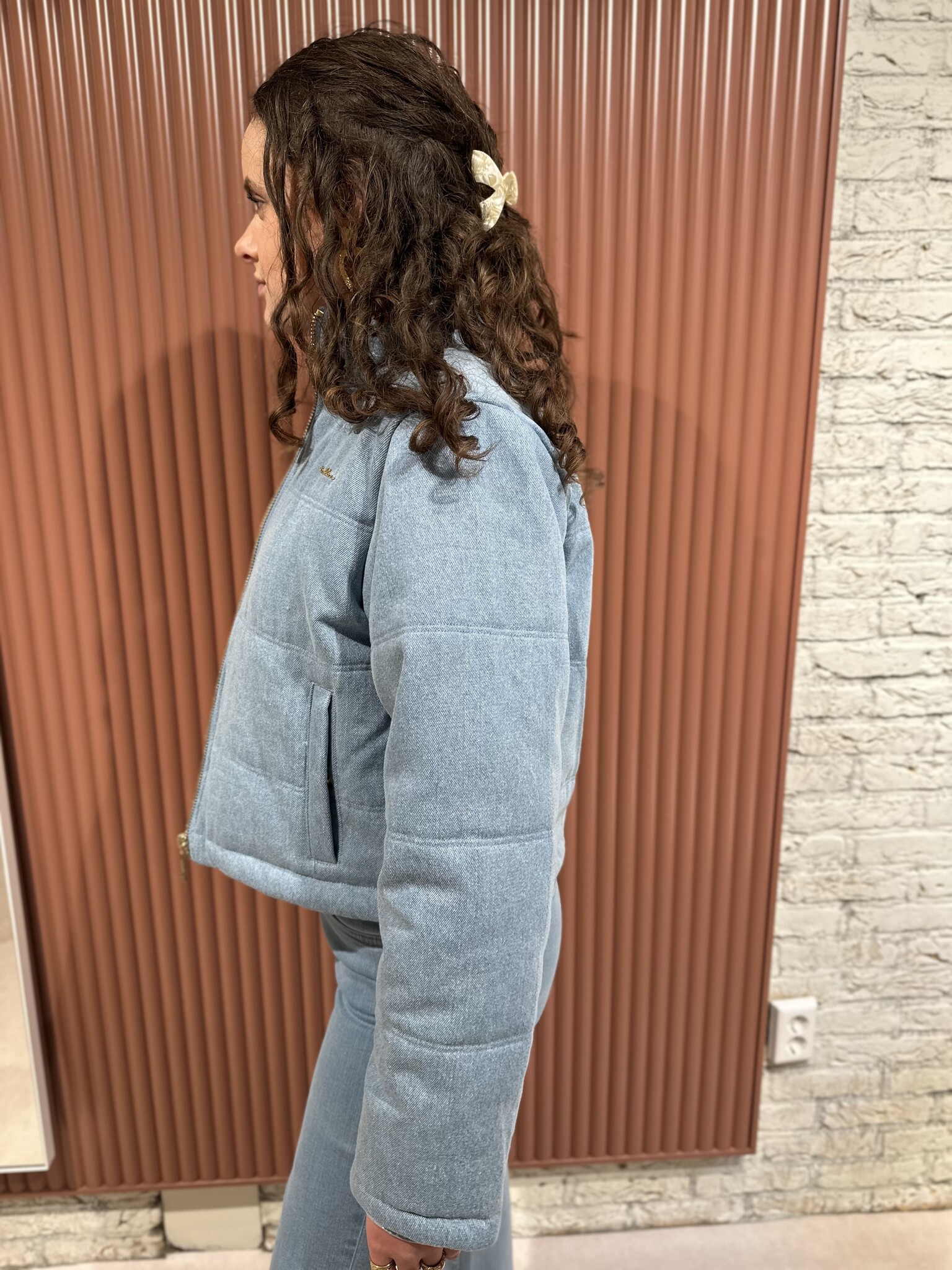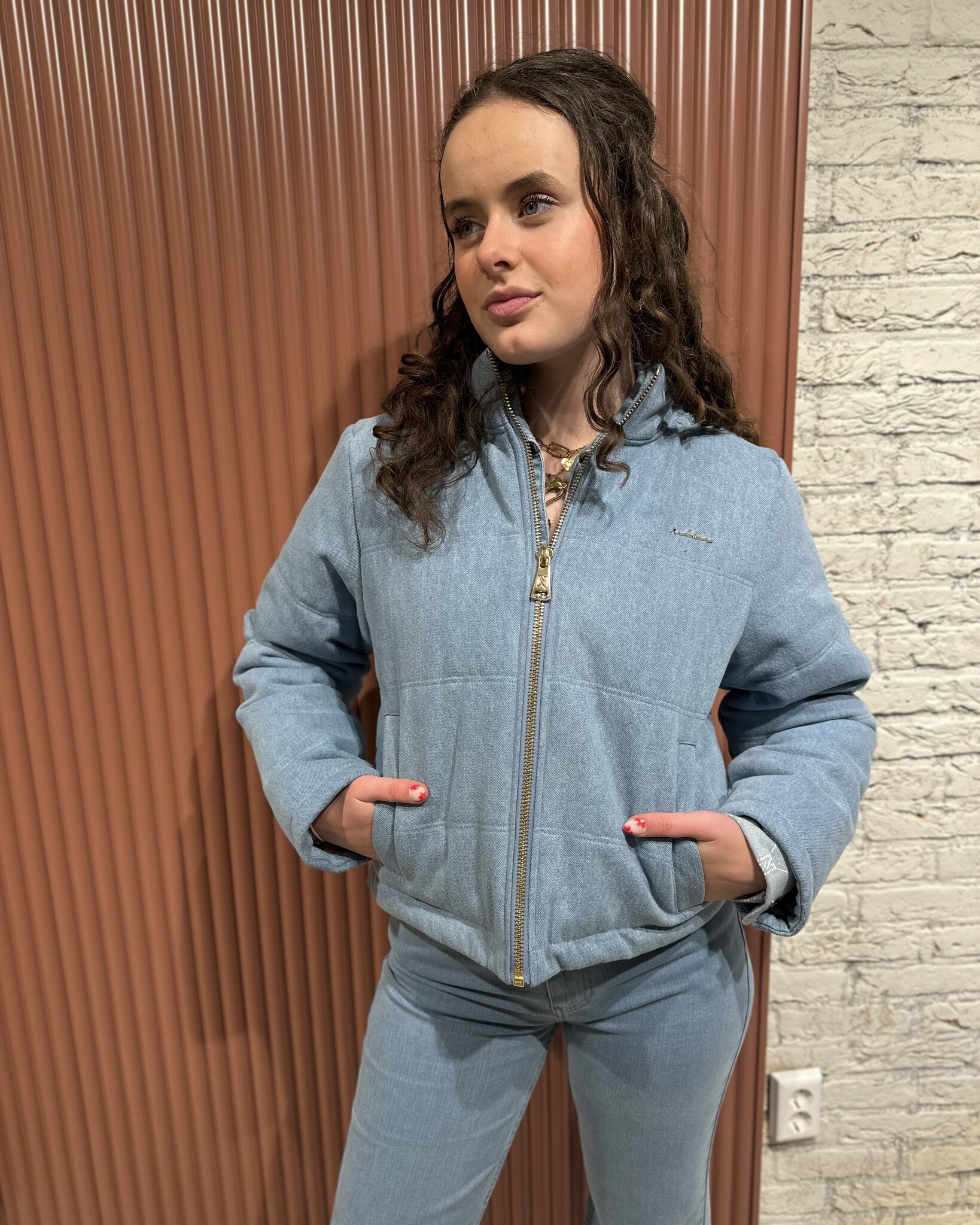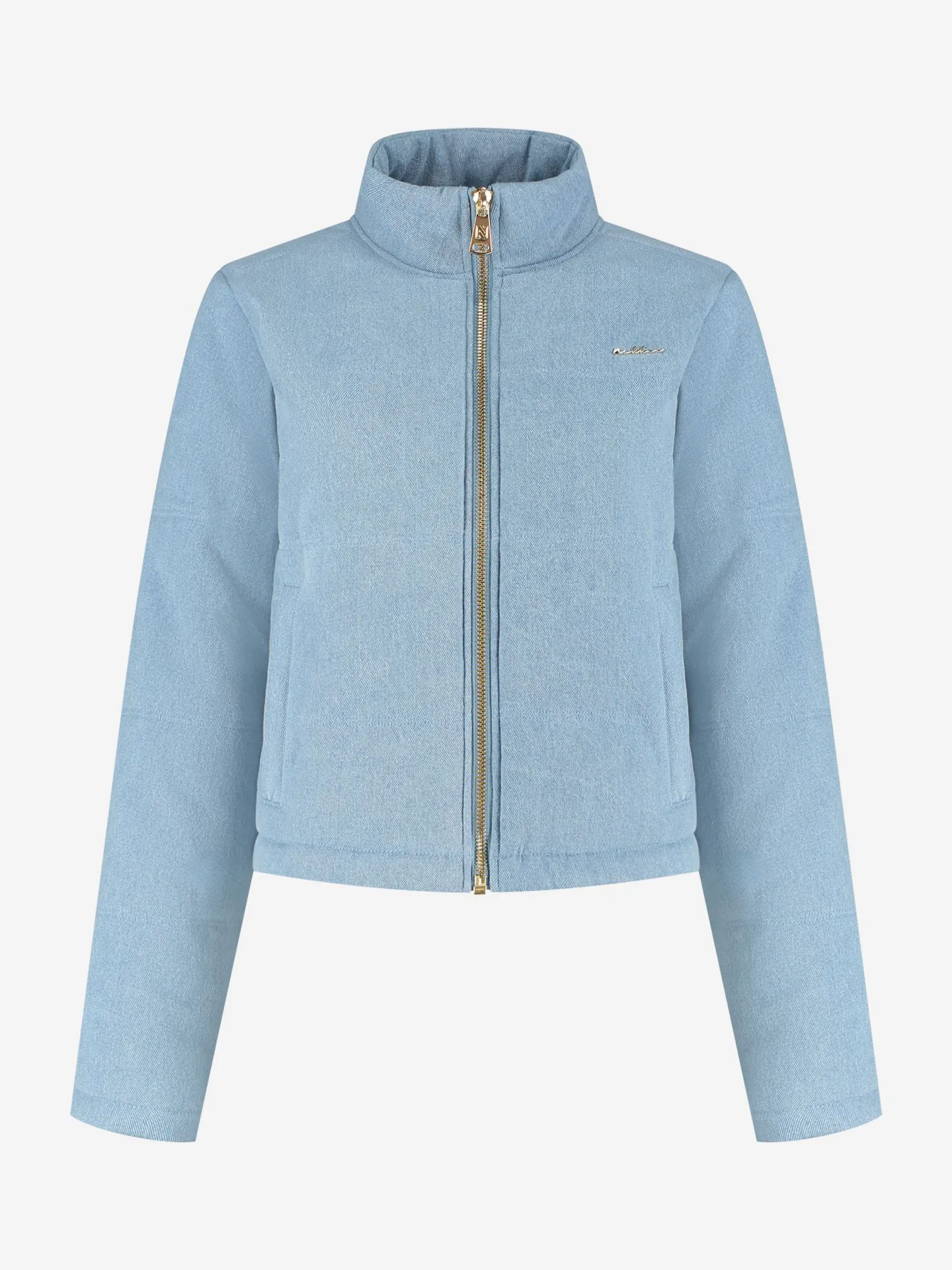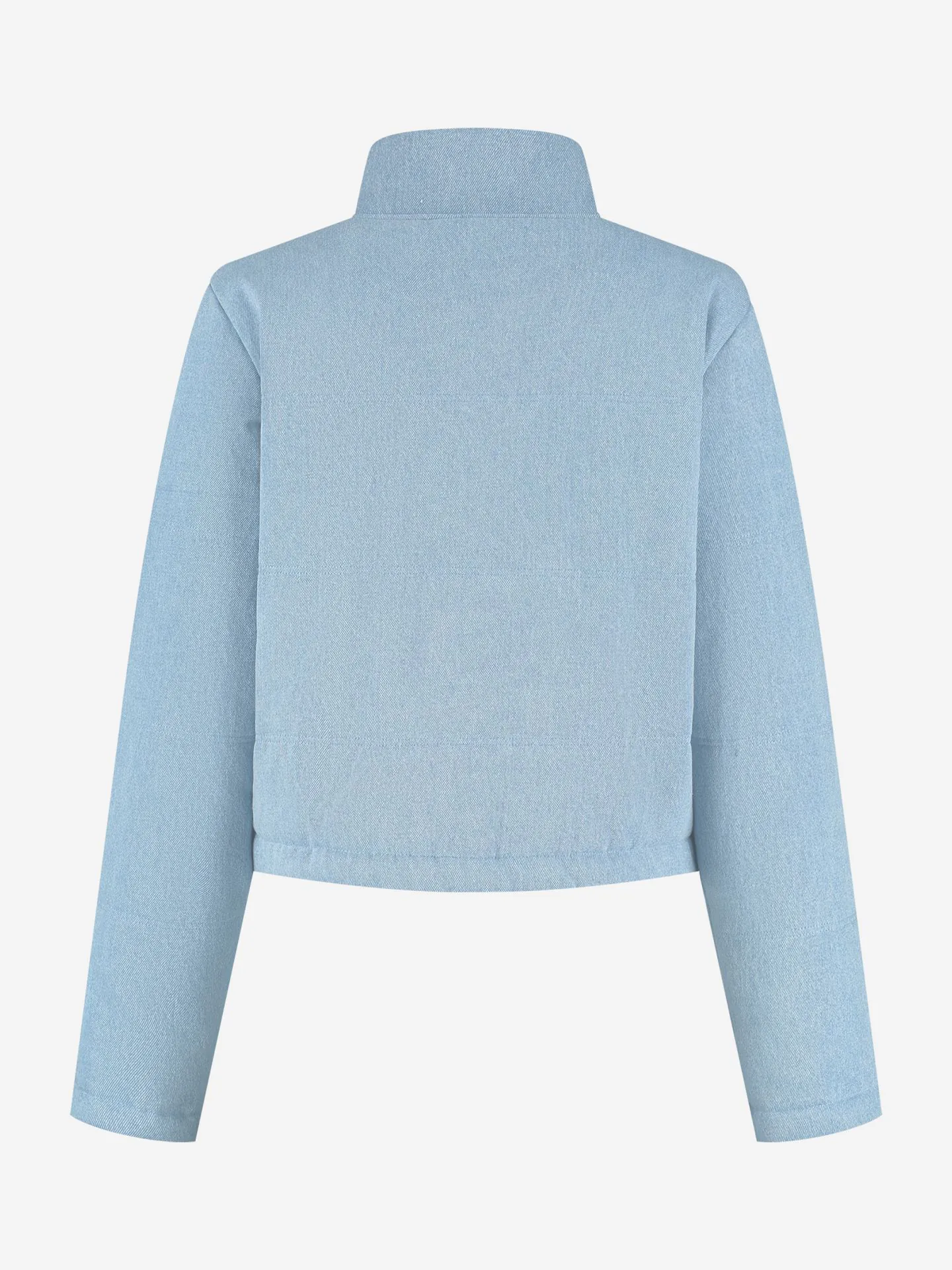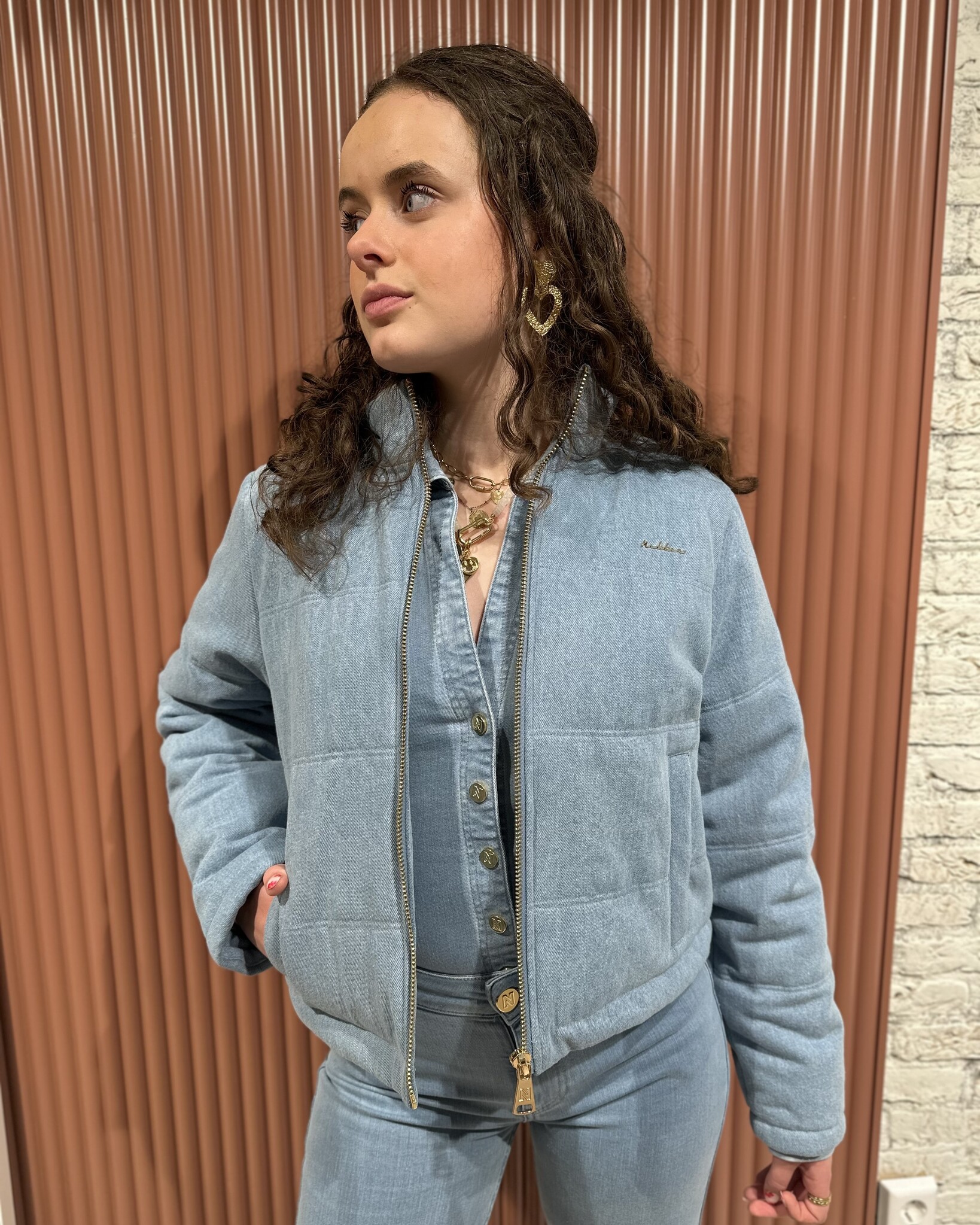 De Hasselt Puffer - Light Blue van NIKKIE is een korte puffer jas met een denim-look, zakken en een subtiel NIKKIE logo. De jas heeft een hoge hals, een ritssluiting en een wijde pasvorm.