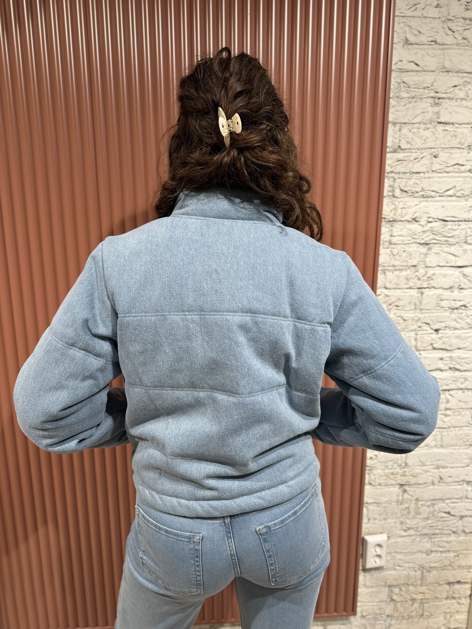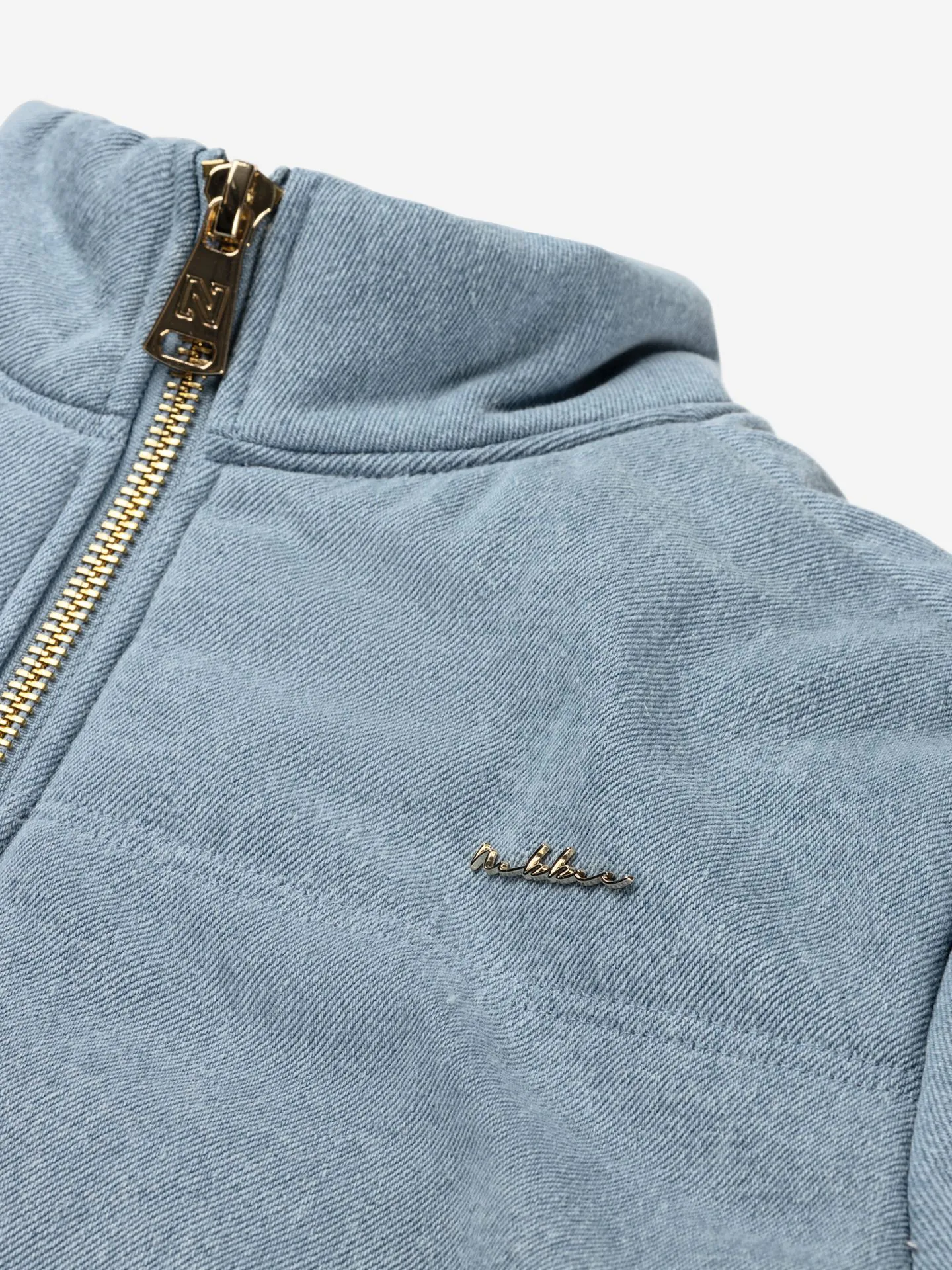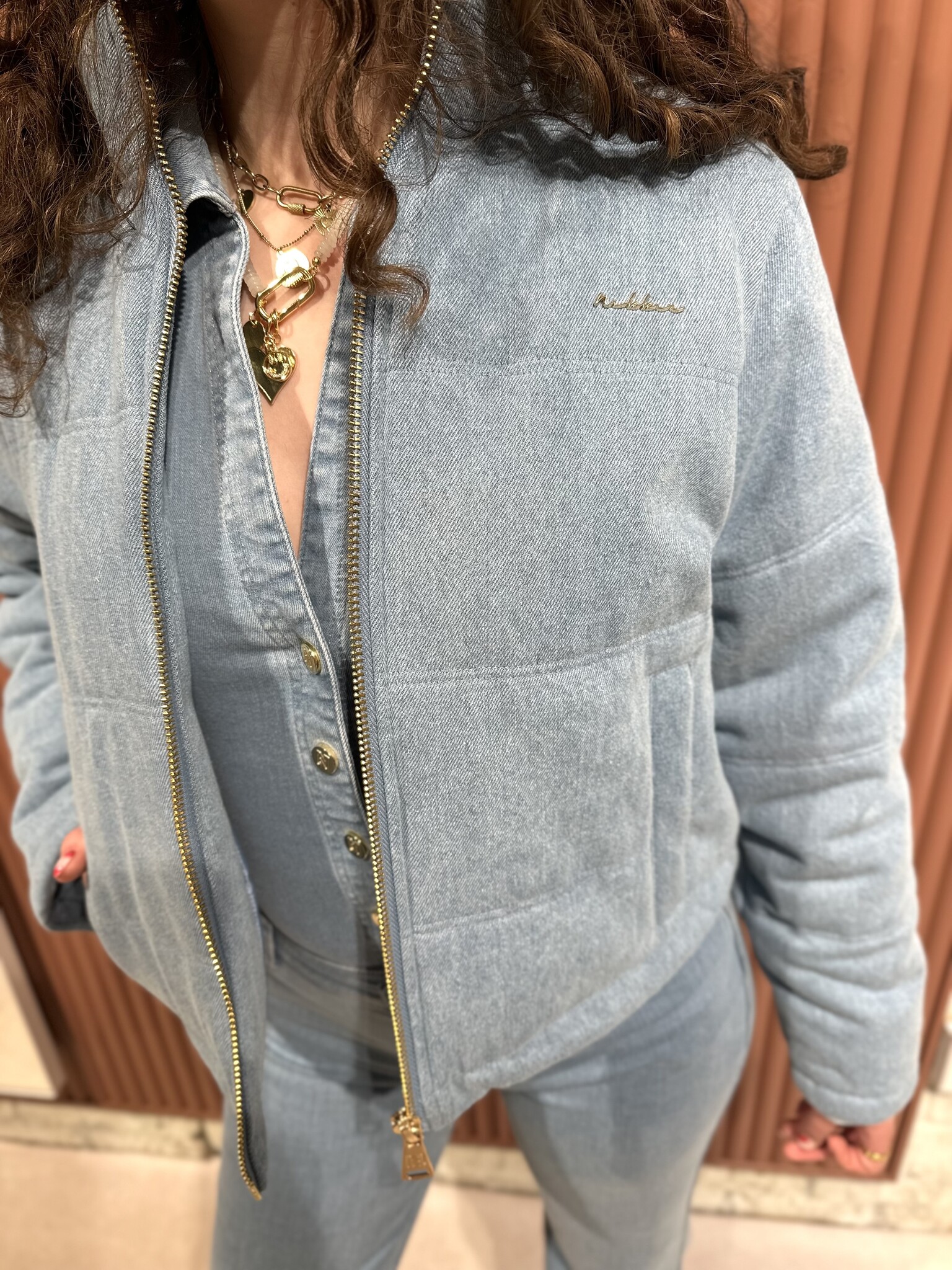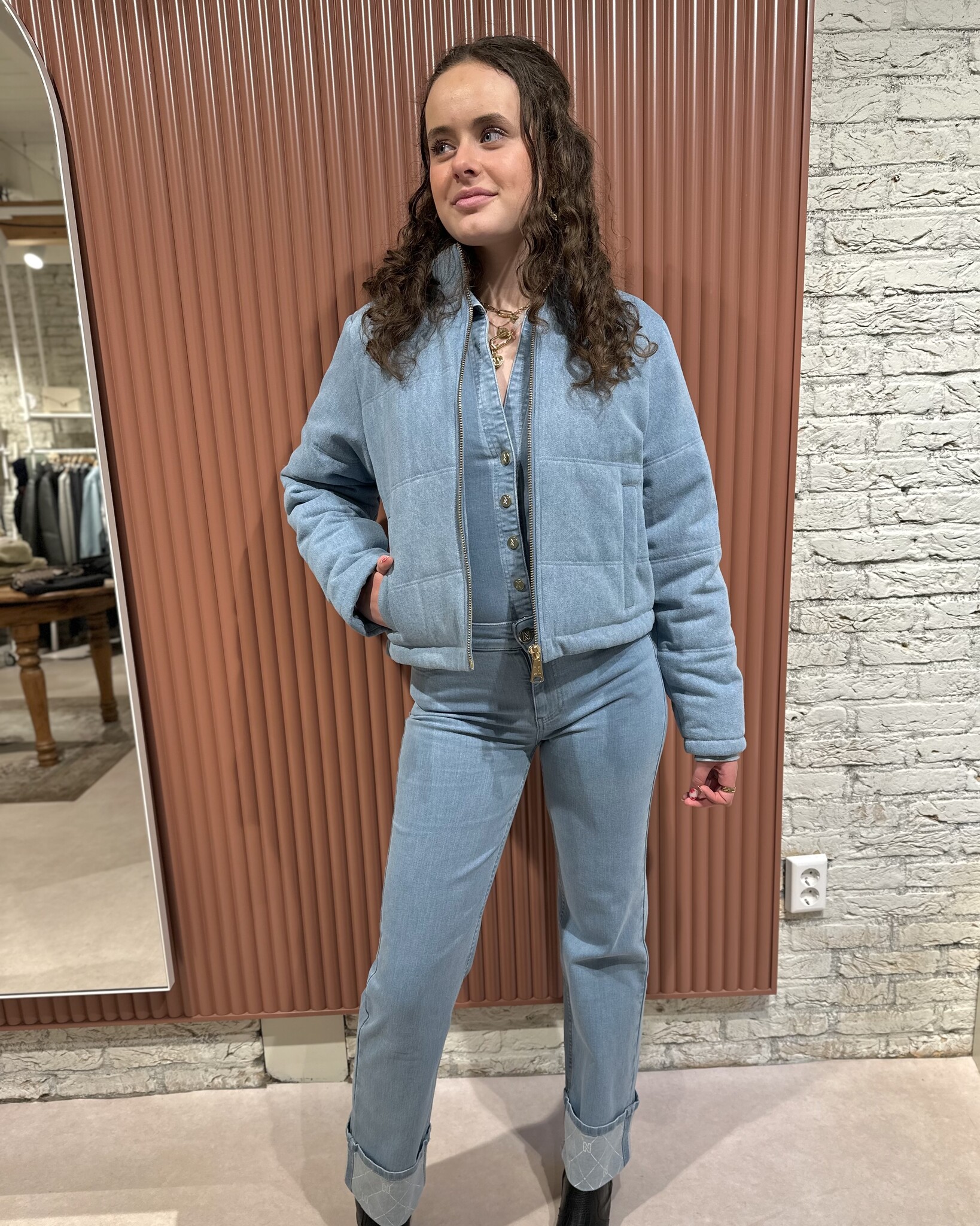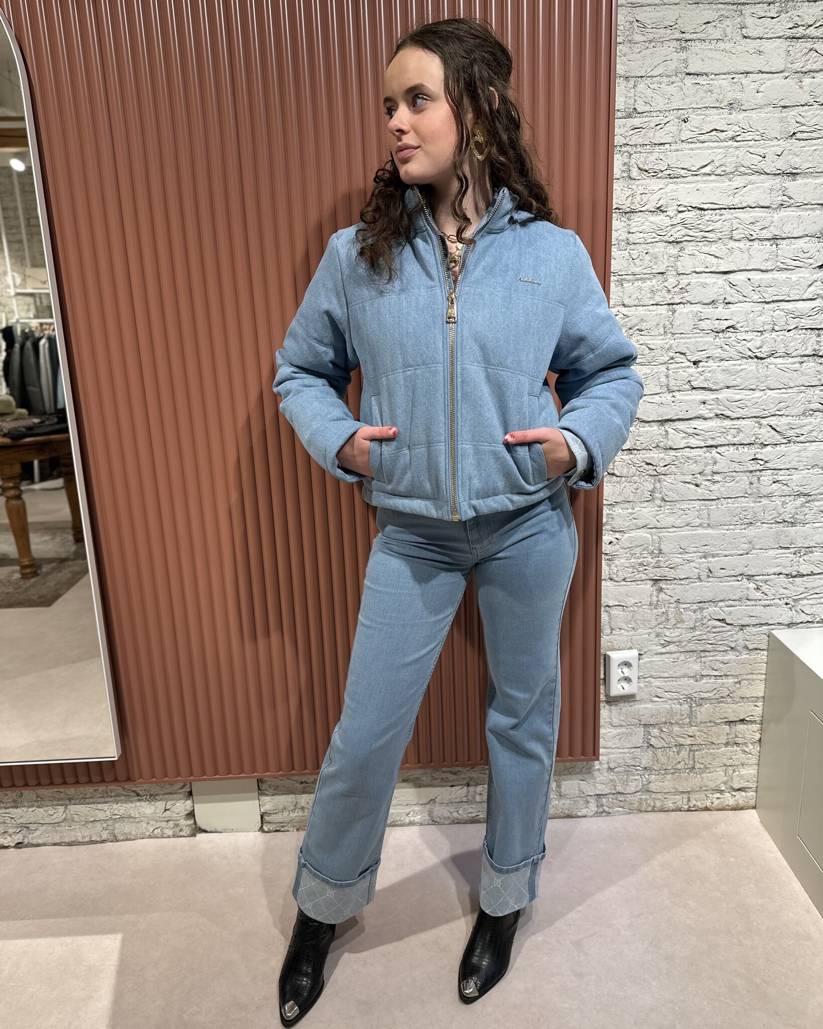 De Hasselt Puffer - Light Blue van NIKKIE is een korte puffer jas met een denim-look, zakken en een subtiel NIKKIE logo. De jas heeft een hoge hals, een ritssluiting en een wijde pasvorm.