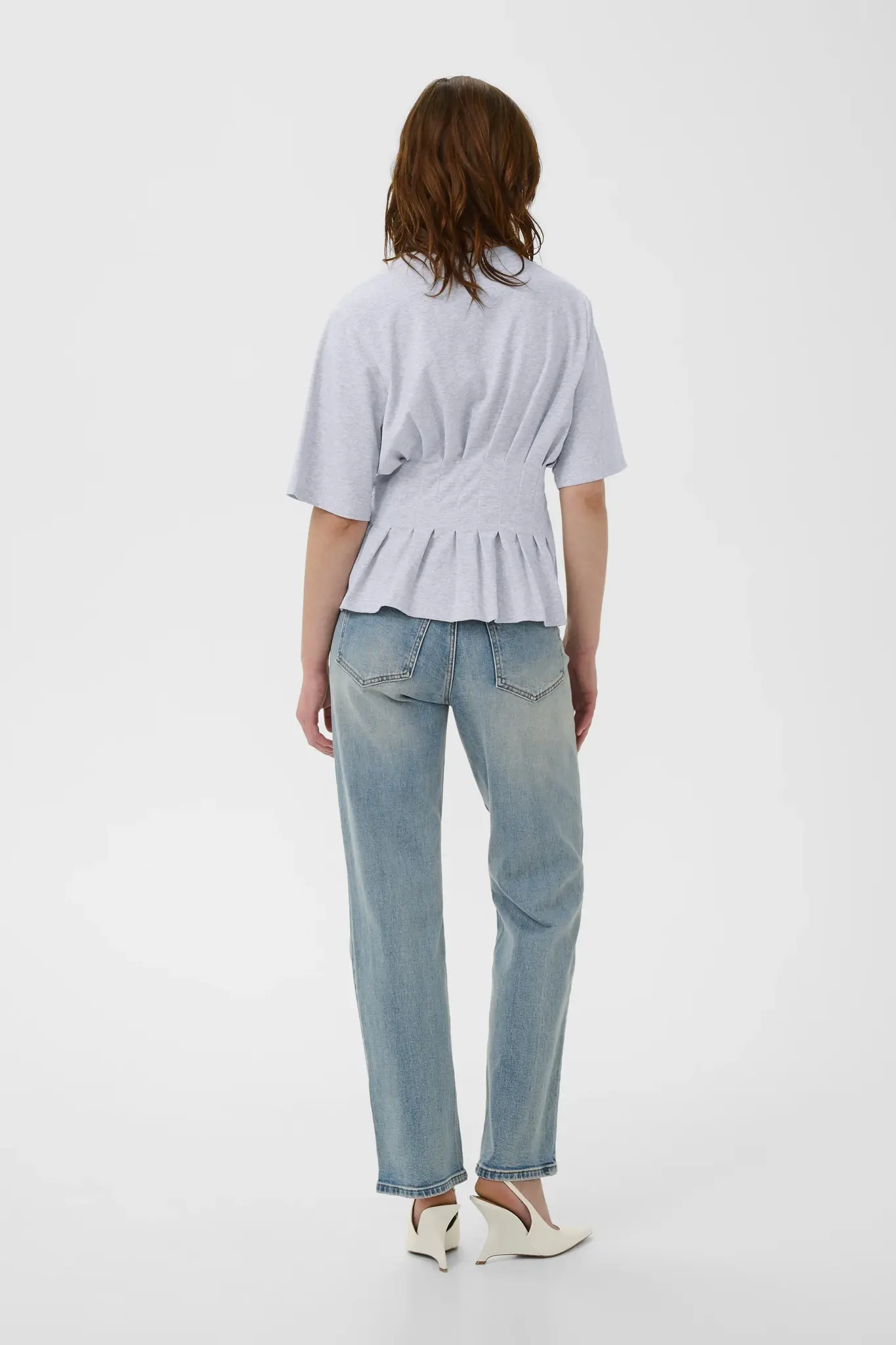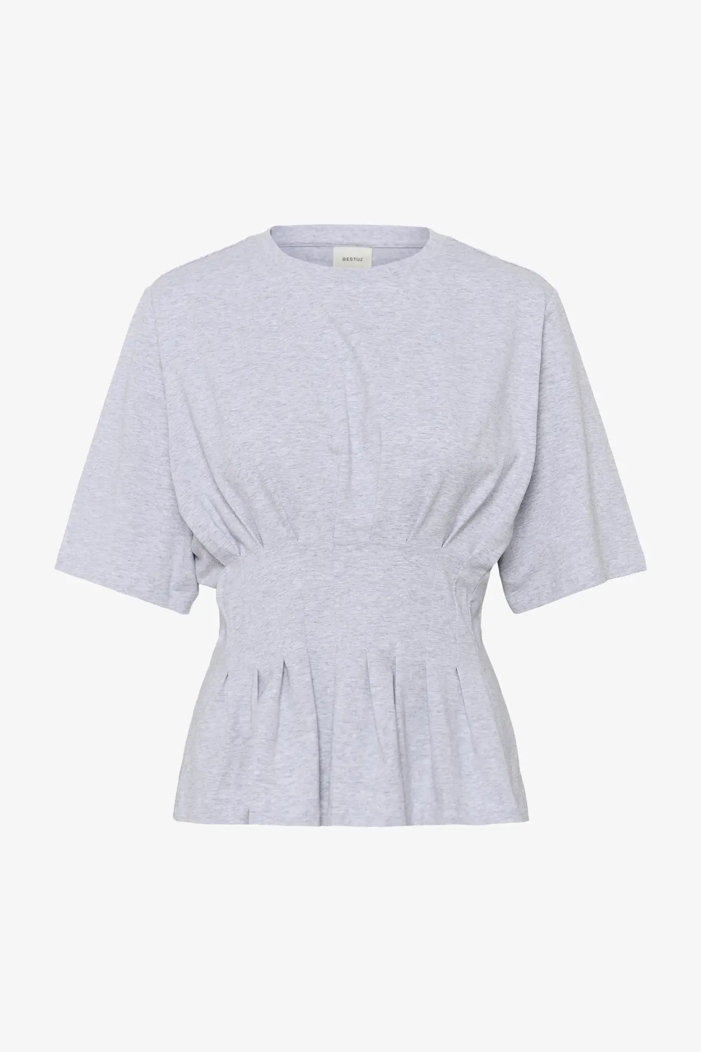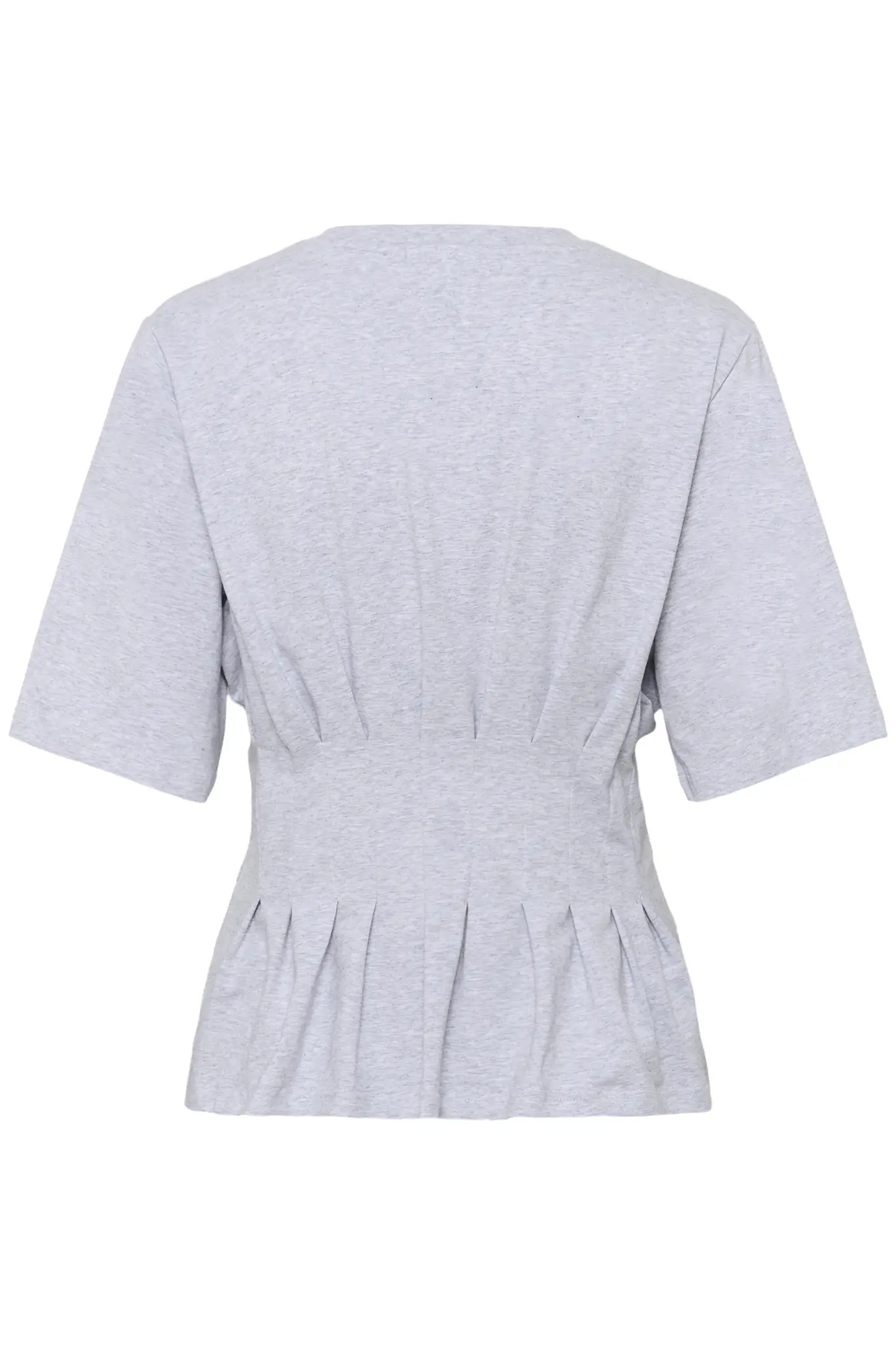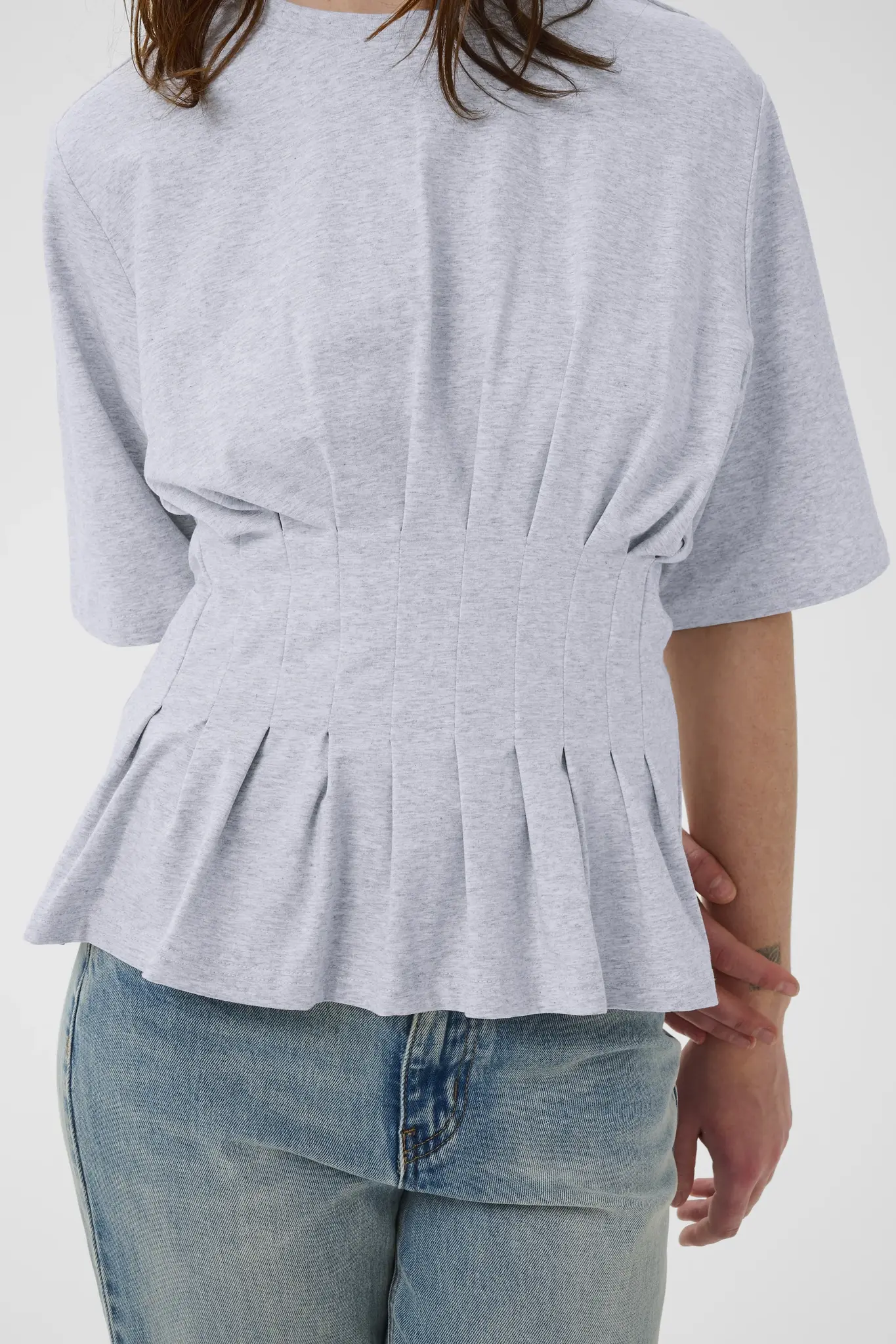 De Inez Tee van Gestuz in de kleur Ultra Light Grey Mélange is een getailleerde lichtgrijze damestop met ronde hals en half lange mouwen. Subtiele plissé details zorgen voor een stijlvolle uitstraling. Deze comfortabele top is veelzijdig te dragen en makkelijk te combineren met je favoriete outfits.