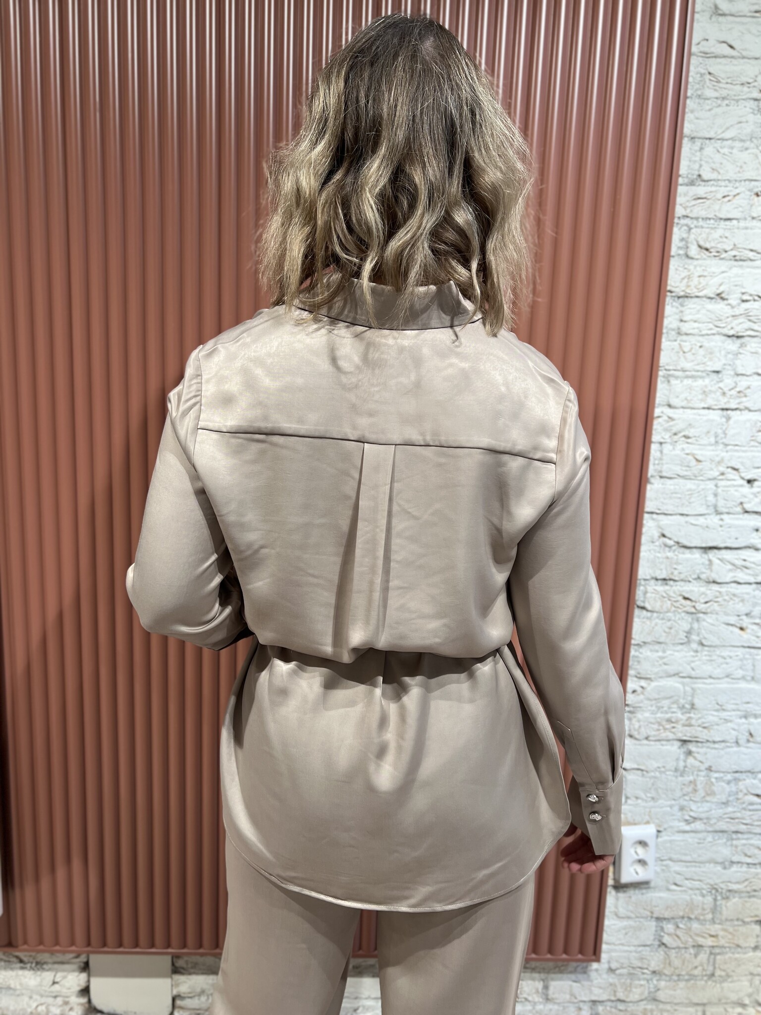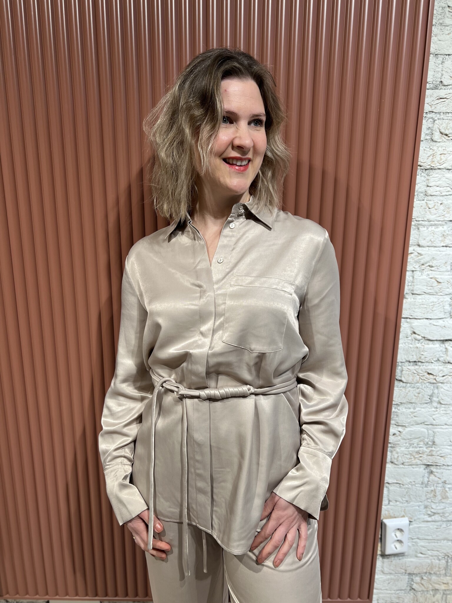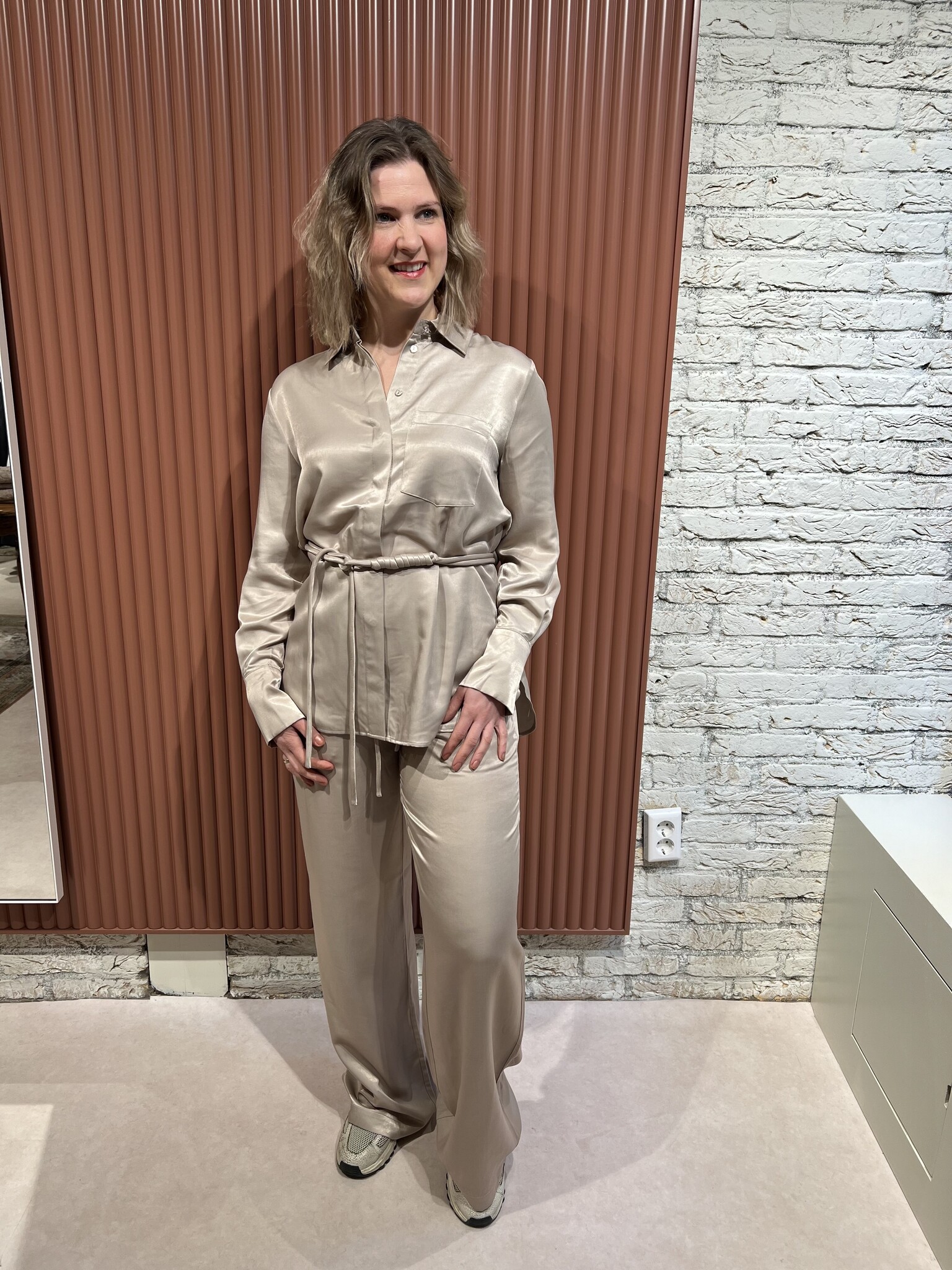 Voel je luxueus in deze Joni belted oversized shirt van Dante6 in de kleur Timeless Taupe. Het relaxte model heeft één borstzak. Het glanzende materiaal wordt geaccentueerd door het fraaie knoopdetail aan de manchetten en bij de kraag. Het overhemd wordt geleverd met een bijpassende luxe riem die je om je middel kunt strikken. Combineer dit shirt met de bijpassende broek Noldy voor een combi-set DANTE6-stijl.