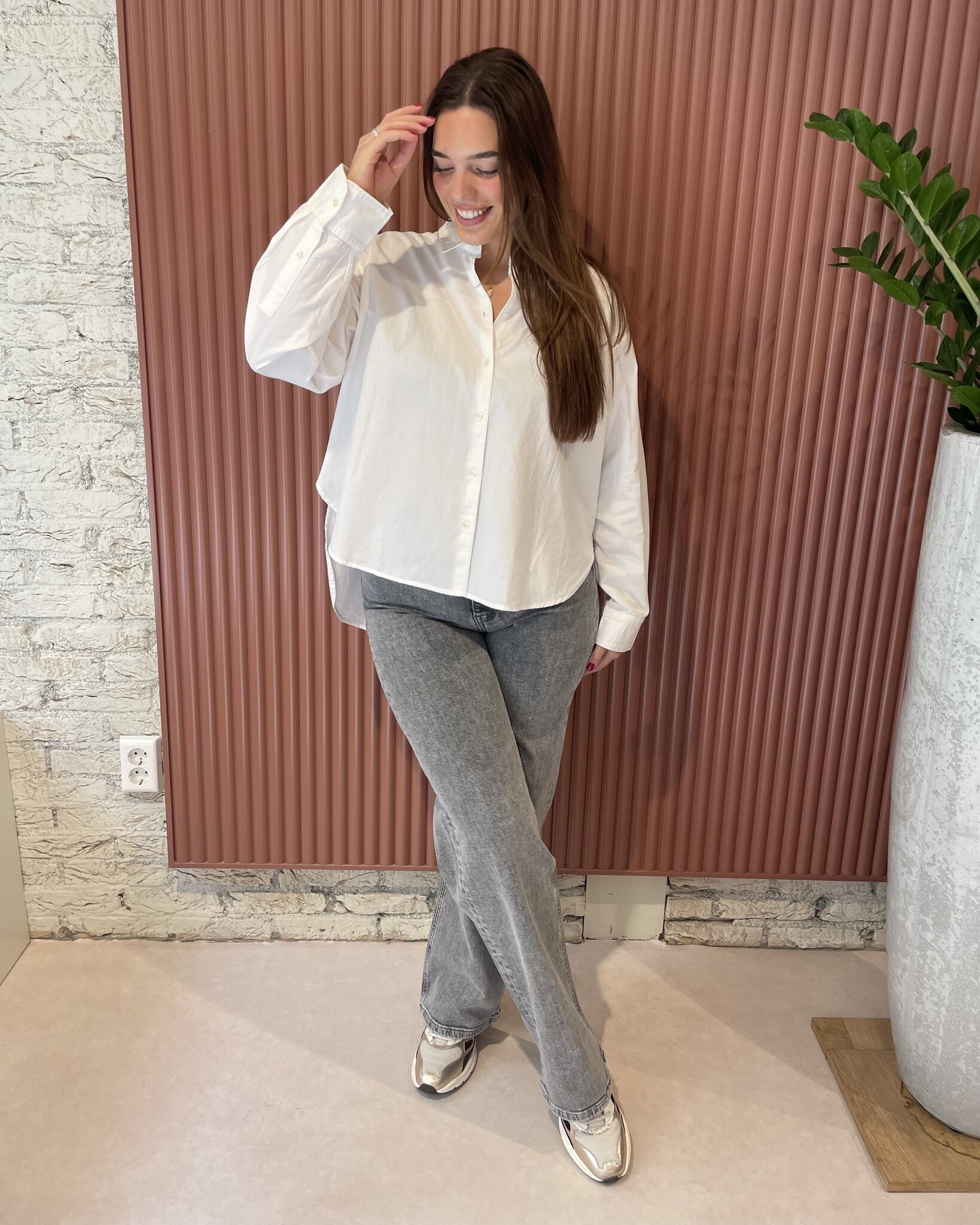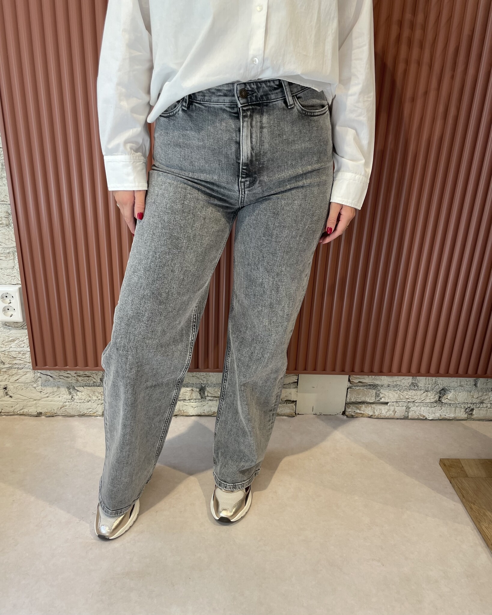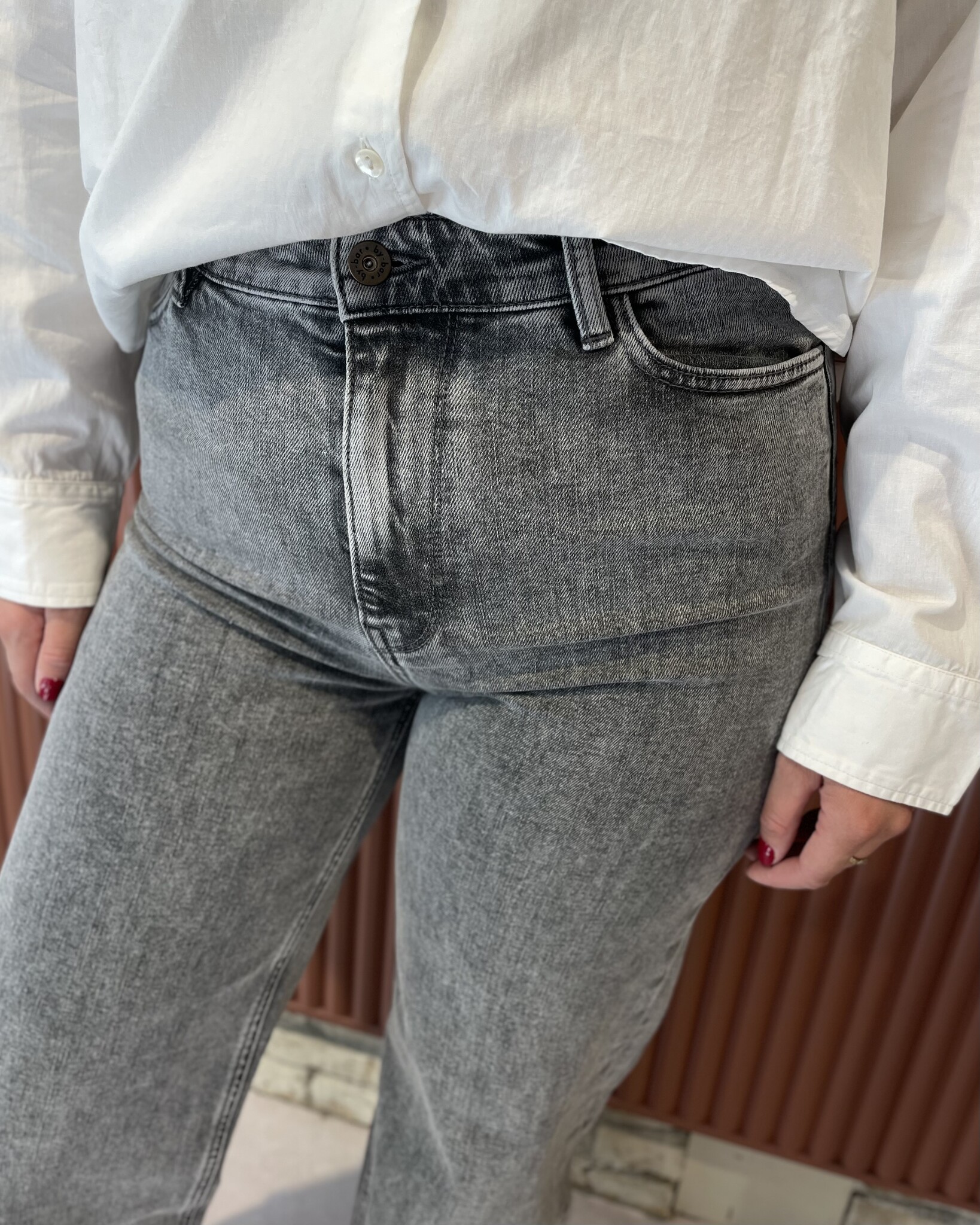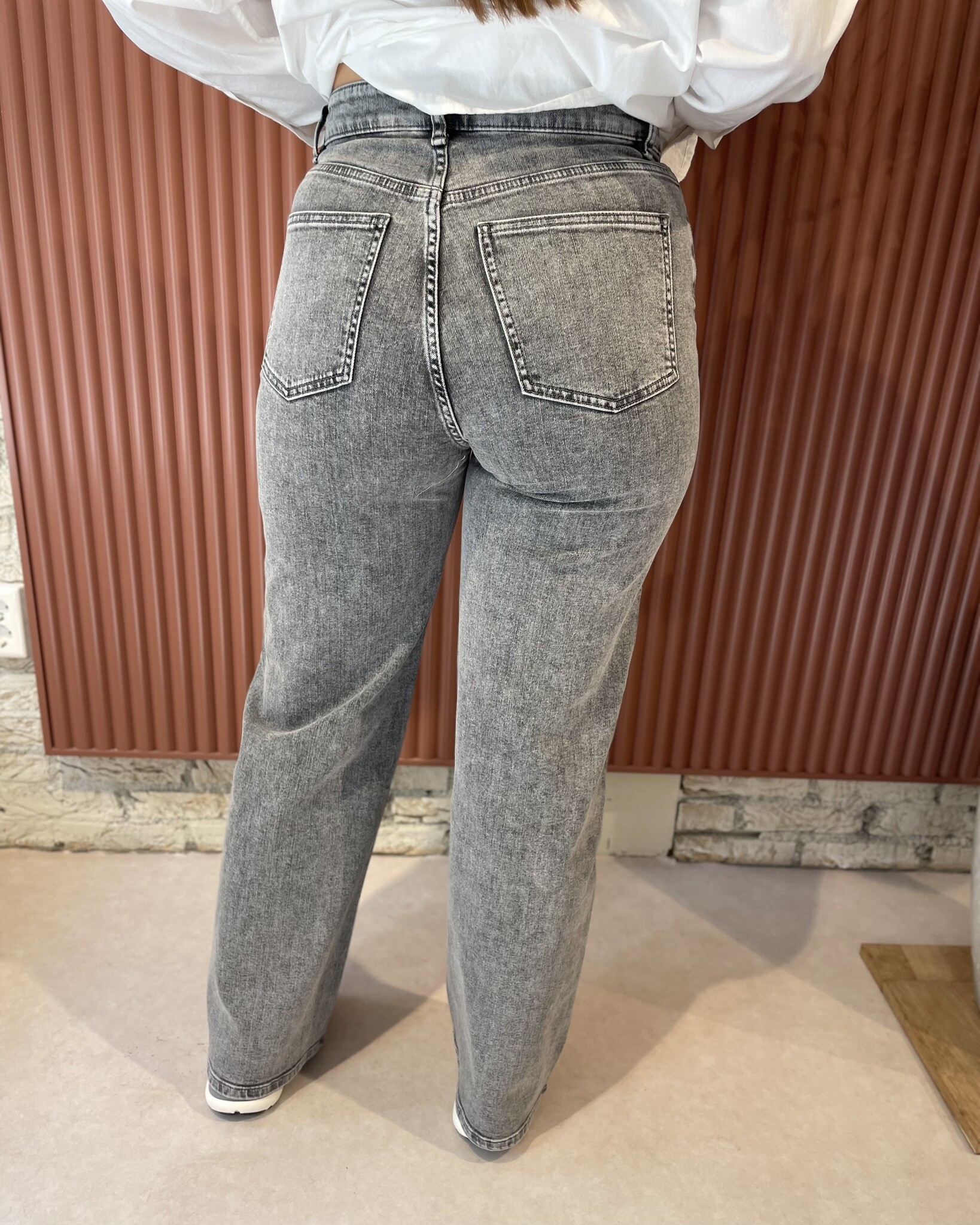 By-Bar Lina Pants | Grey Denim combineert stijl en comfort in één. Deze high waist jeans heeft een rechte, losvallende pasvorm en is gemaakt van 99% biologisch katoen met een vleugje elastaan voor een perfecte pasvorm. De duurzame wassing heeft een lage milieu-impact, gemeten met Jeanologia software.