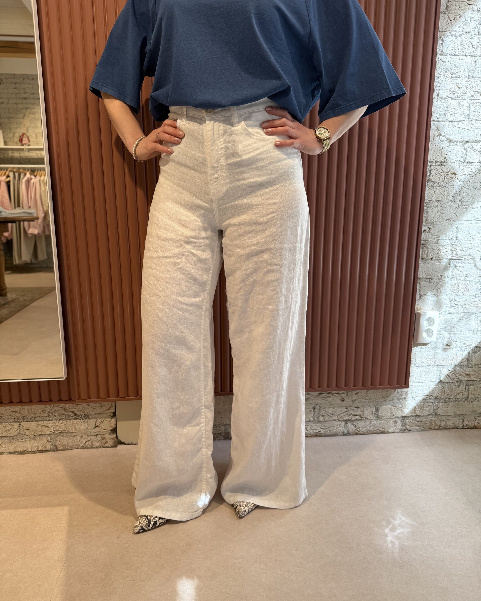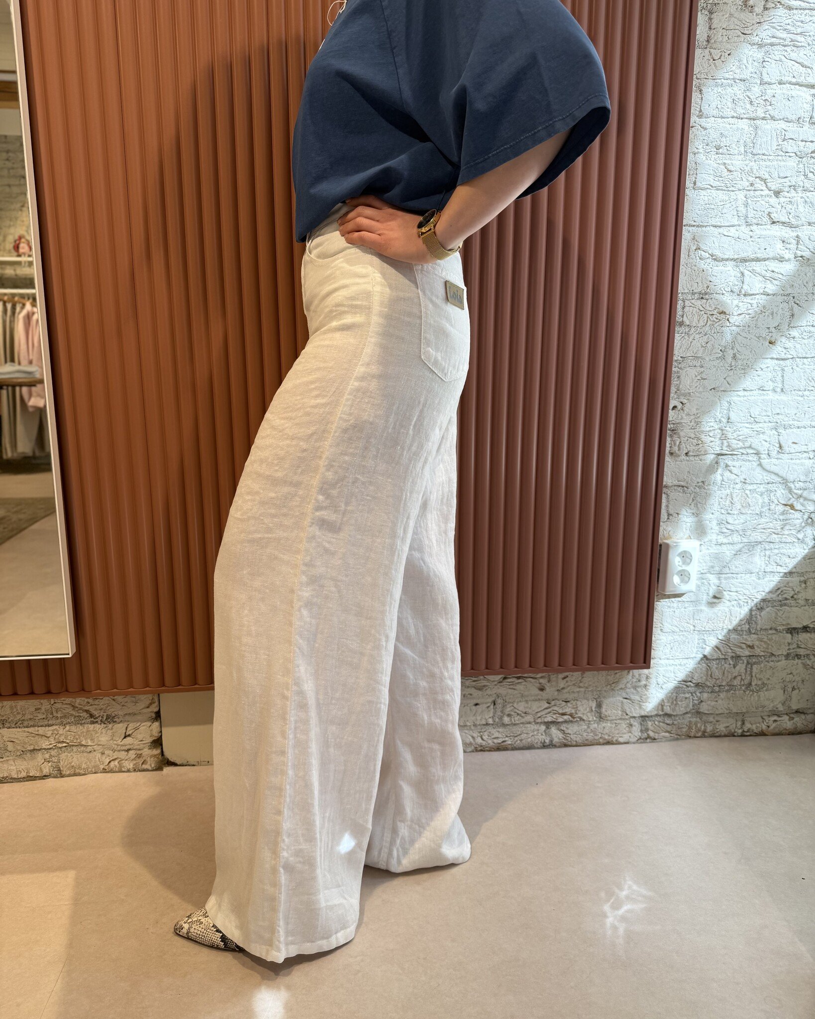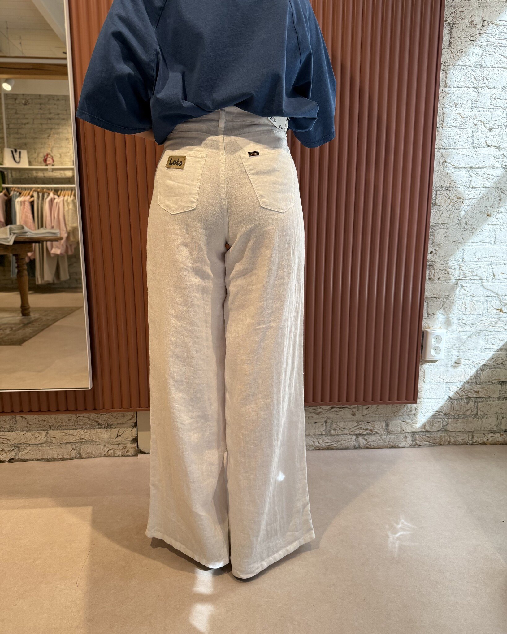 De Marlene van Lois in de kleur White is fijne, luchtige witte broek met een nauwsluitende taille die uitloopt in brede pijpen. De high-waisted ontwerp accentueert de taille, terwijl de extra wijde pijpen een eigentijdse, ontspannen pasvorm geven. Doordat deze jeans is gemaakt van 100% linnen is dit dé perfecte jeans voor het voorjaar en de zomer!