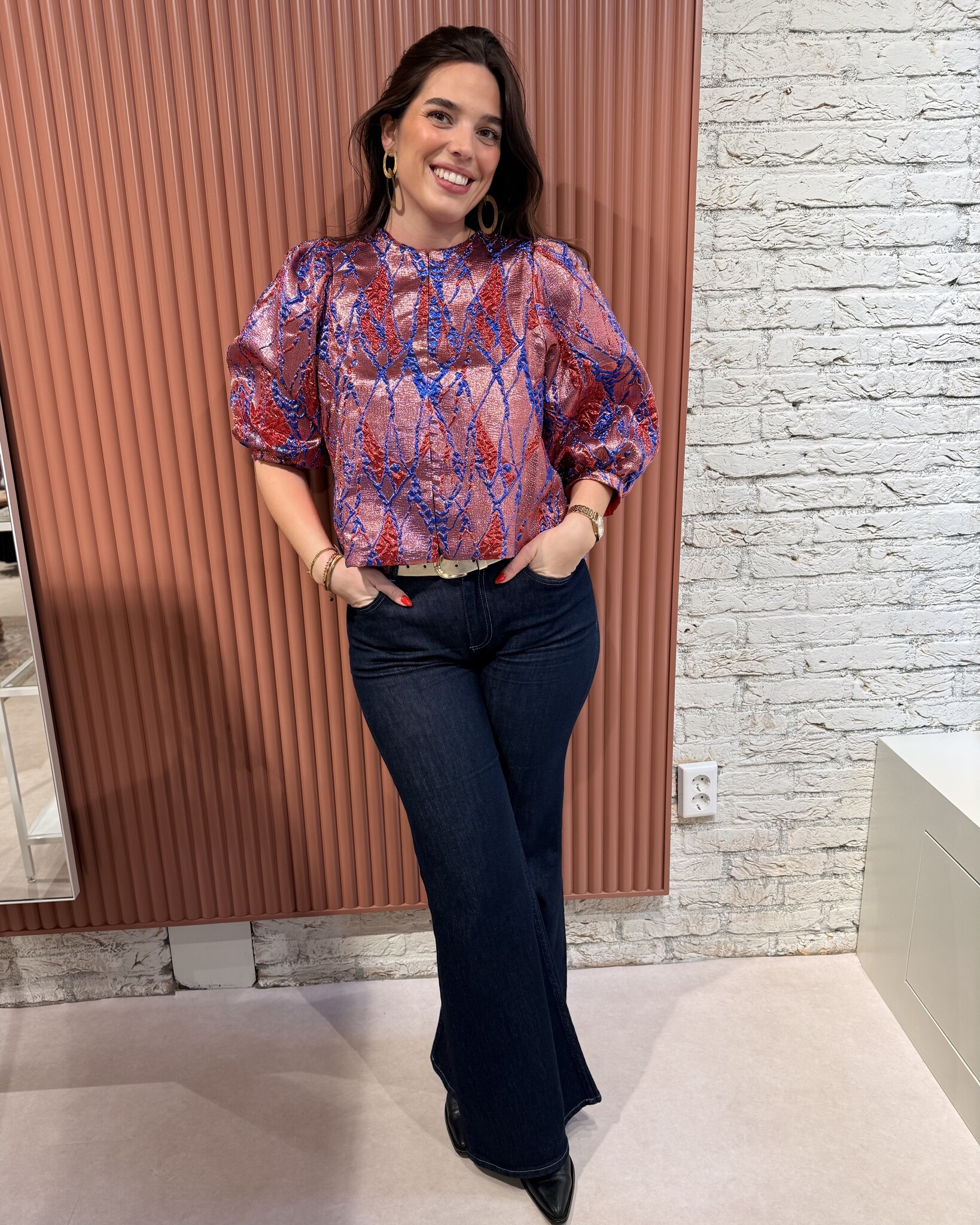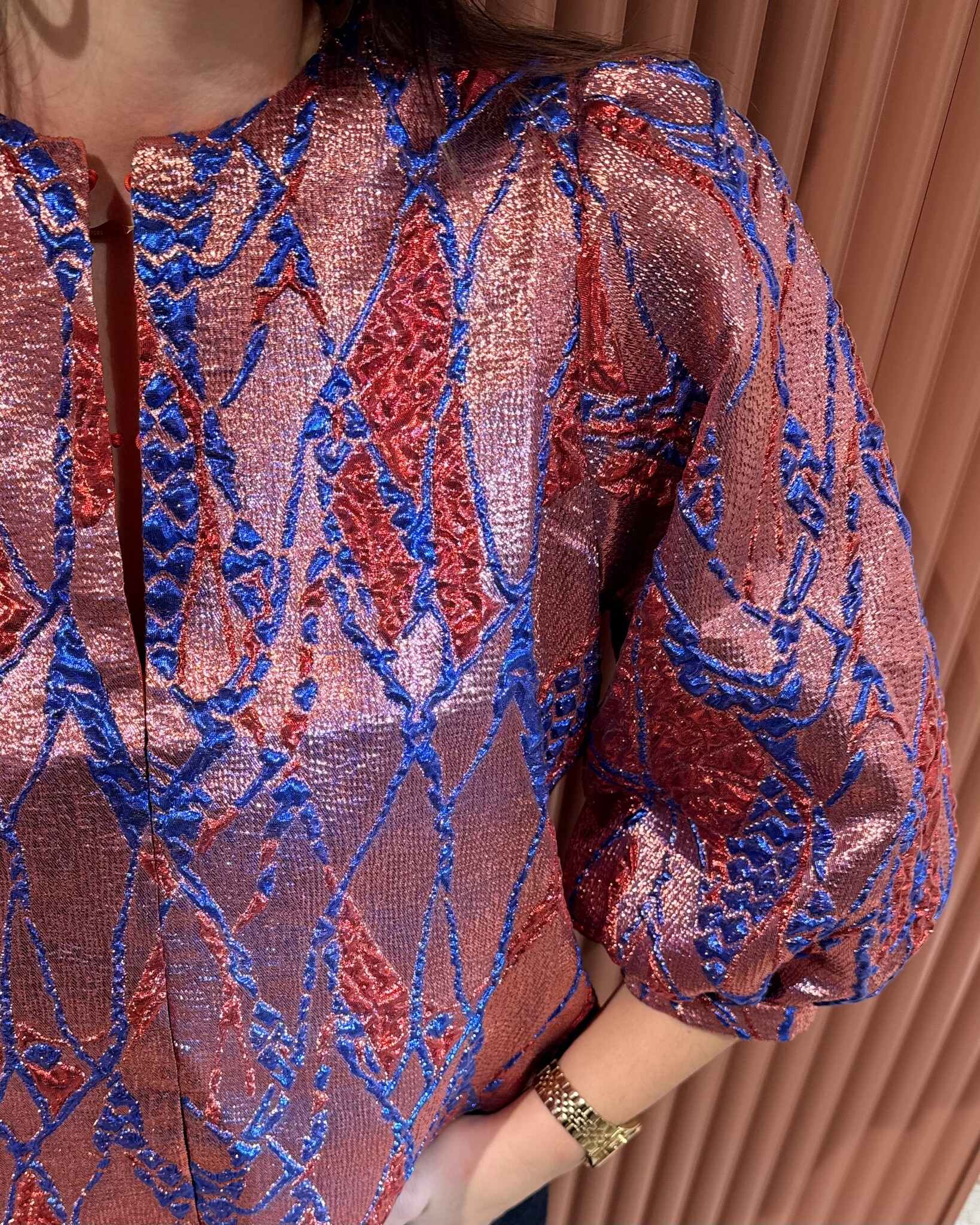 De By-Bar Mauri Jacquard Blouse | Coral is een opvallende en stijlvolle blouse van hoogwaardige jacquard-stof met een elegante glans. Het losse model en de 3/4-mouwen zorgen voor een comfortabele en modieuze pasvorm, terwijl de rijke structuur van het materiaal een statement maakt in elke outfit.