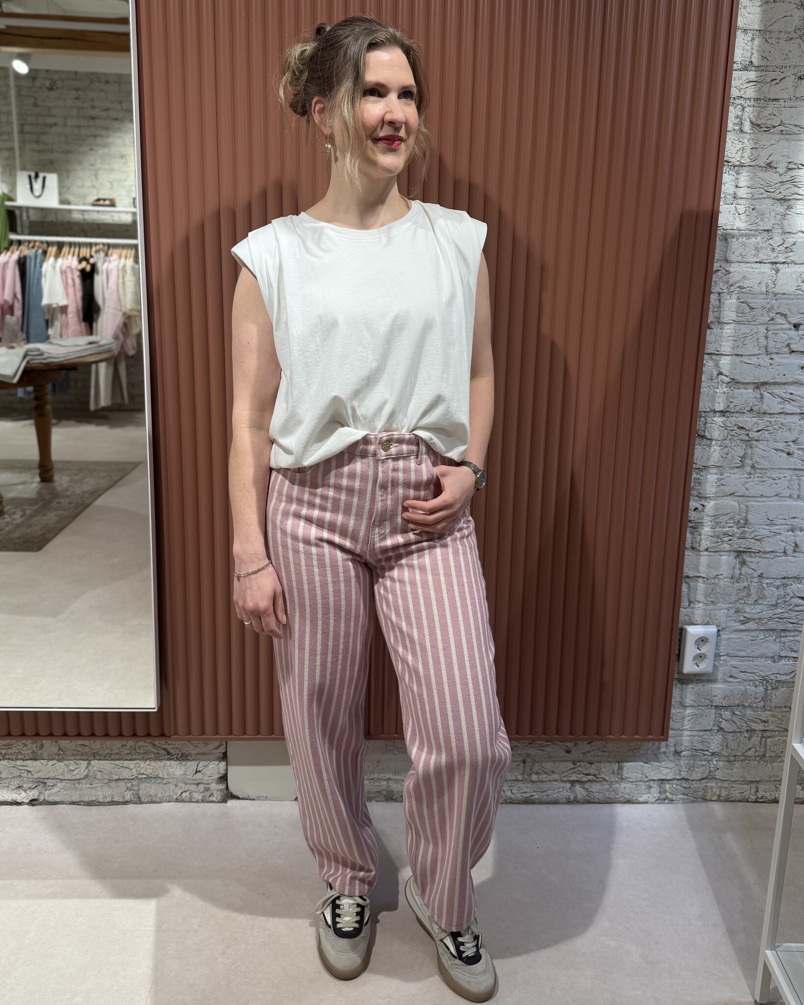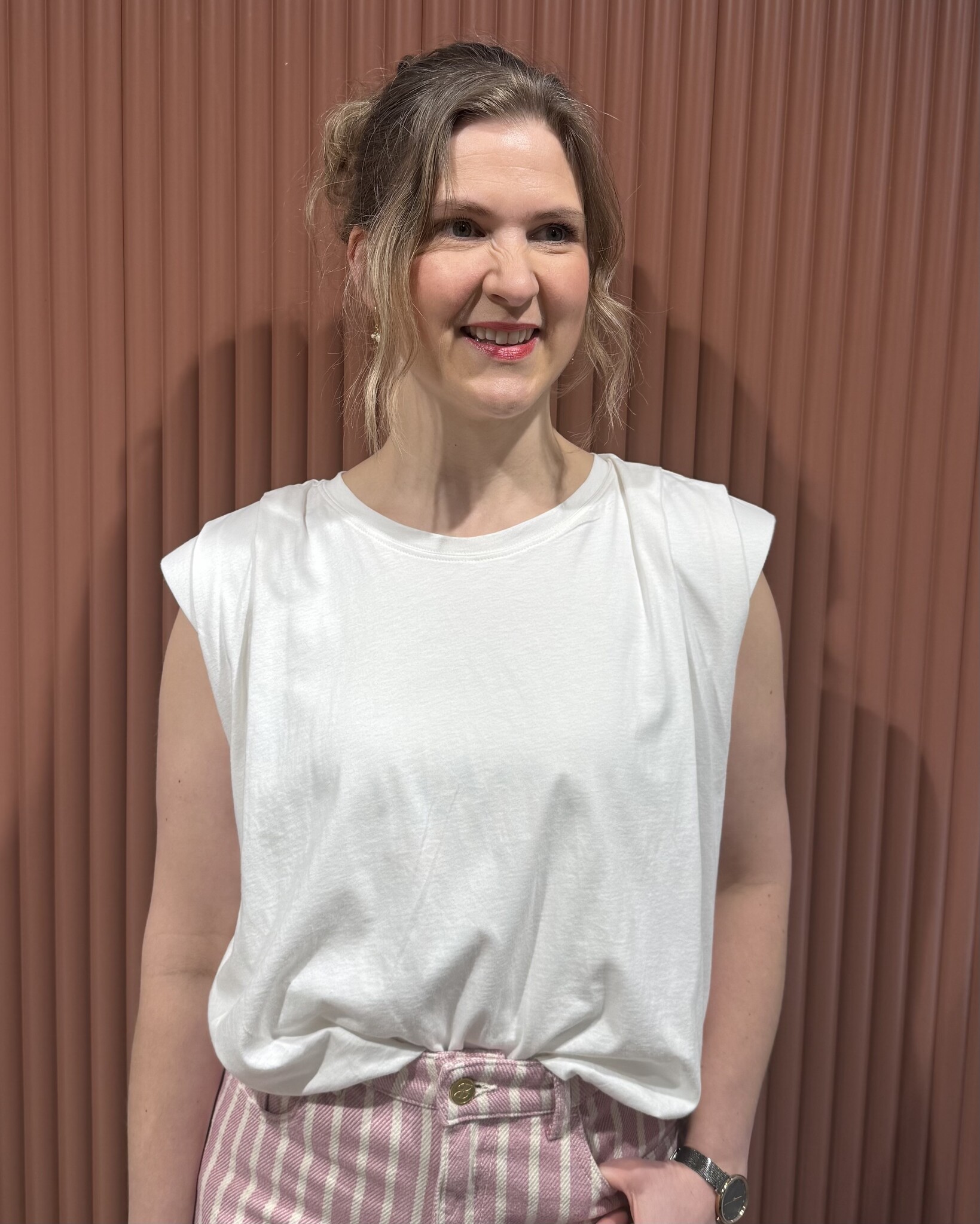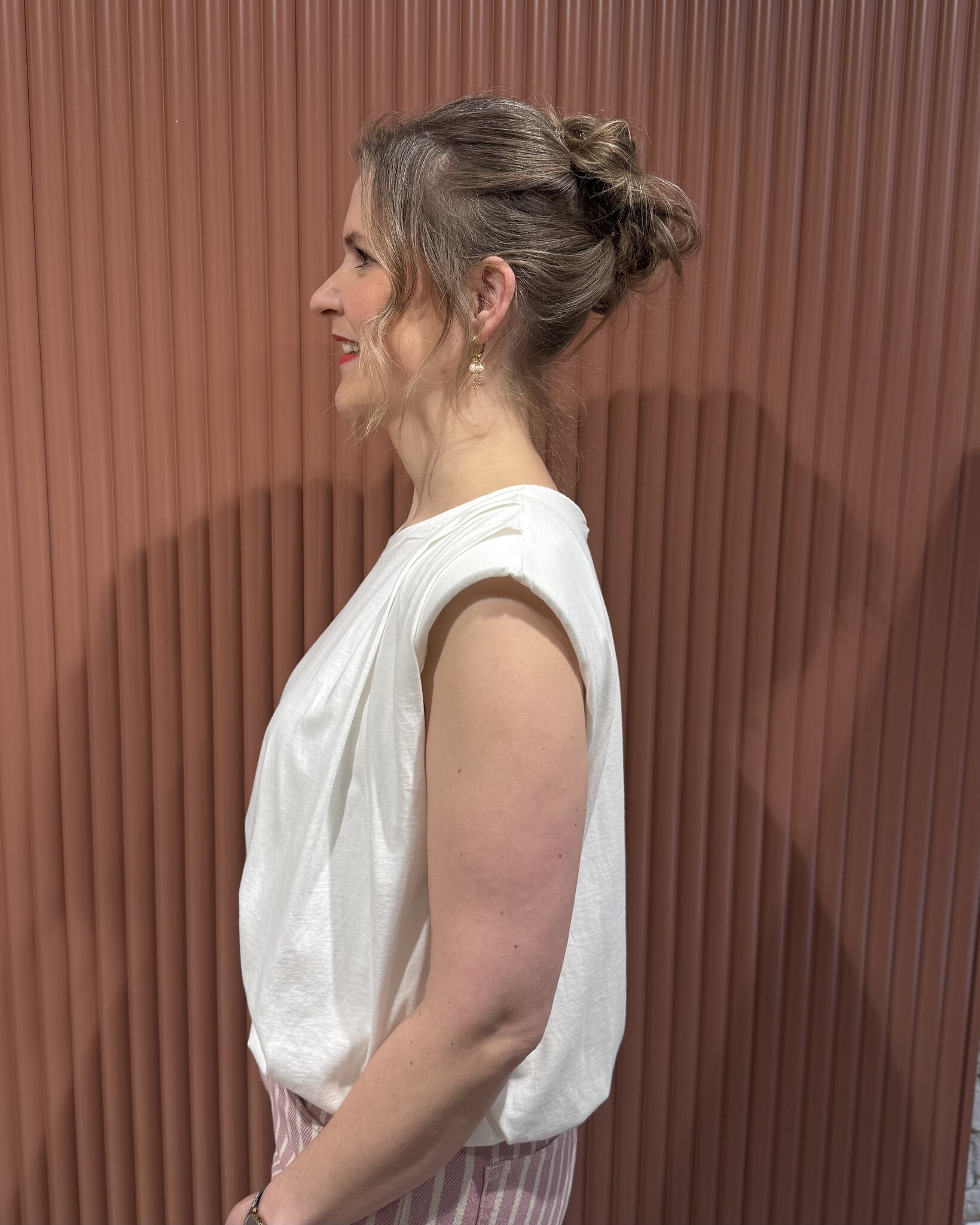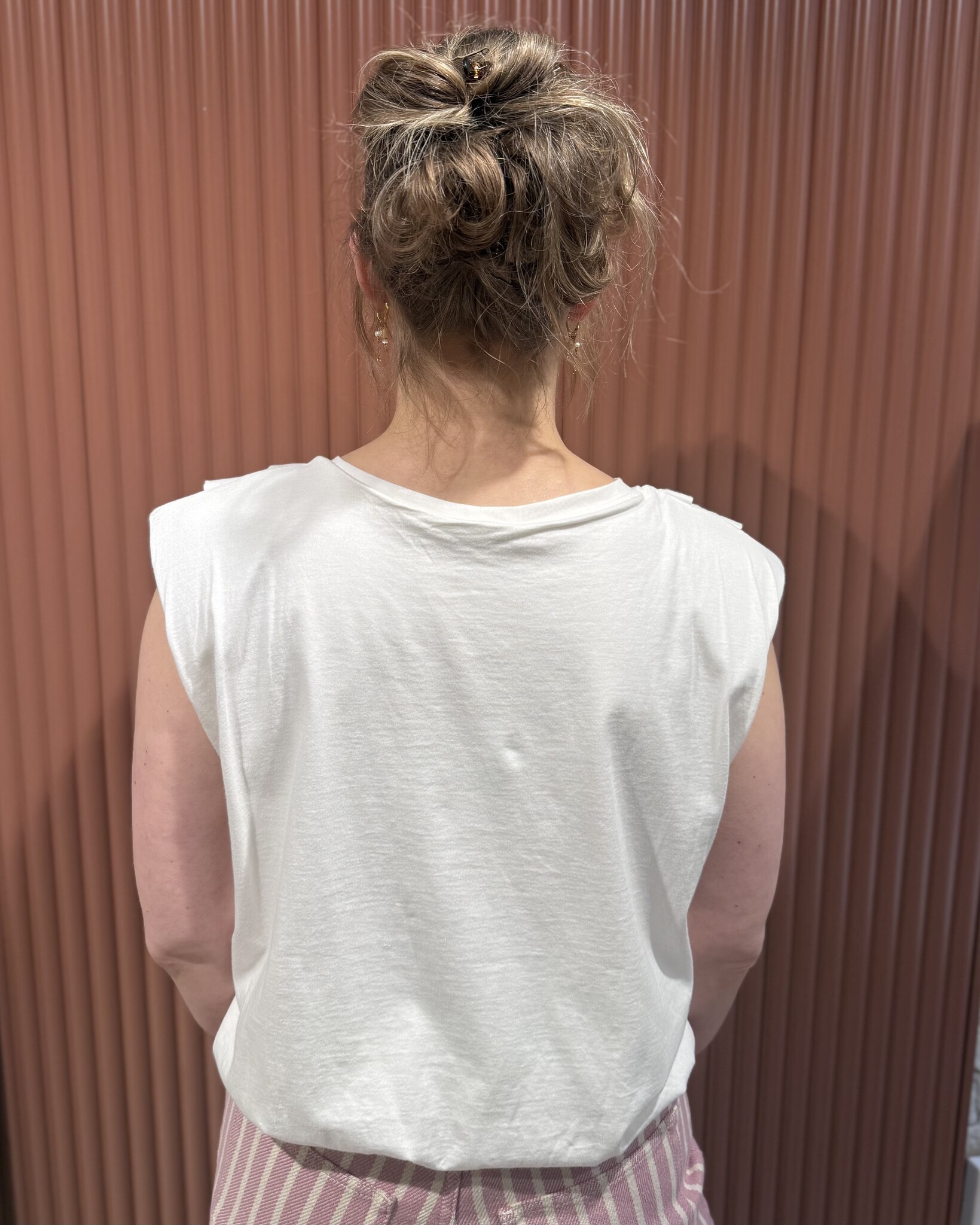 De Nilou Jersey Top van By-Bar in Off White is een mouwloze top met comfortabele normale pasvorm, subtiele geplooide details en ronde halslijn. Schoudervullingen geven een elegante touch voor een casual chic look.