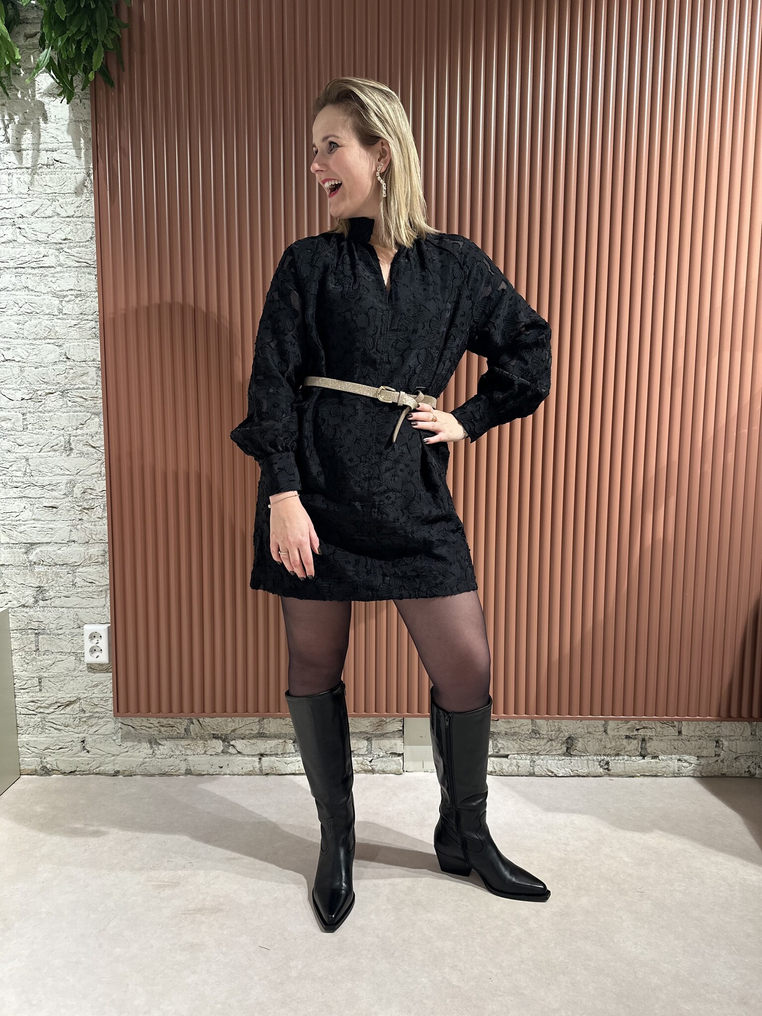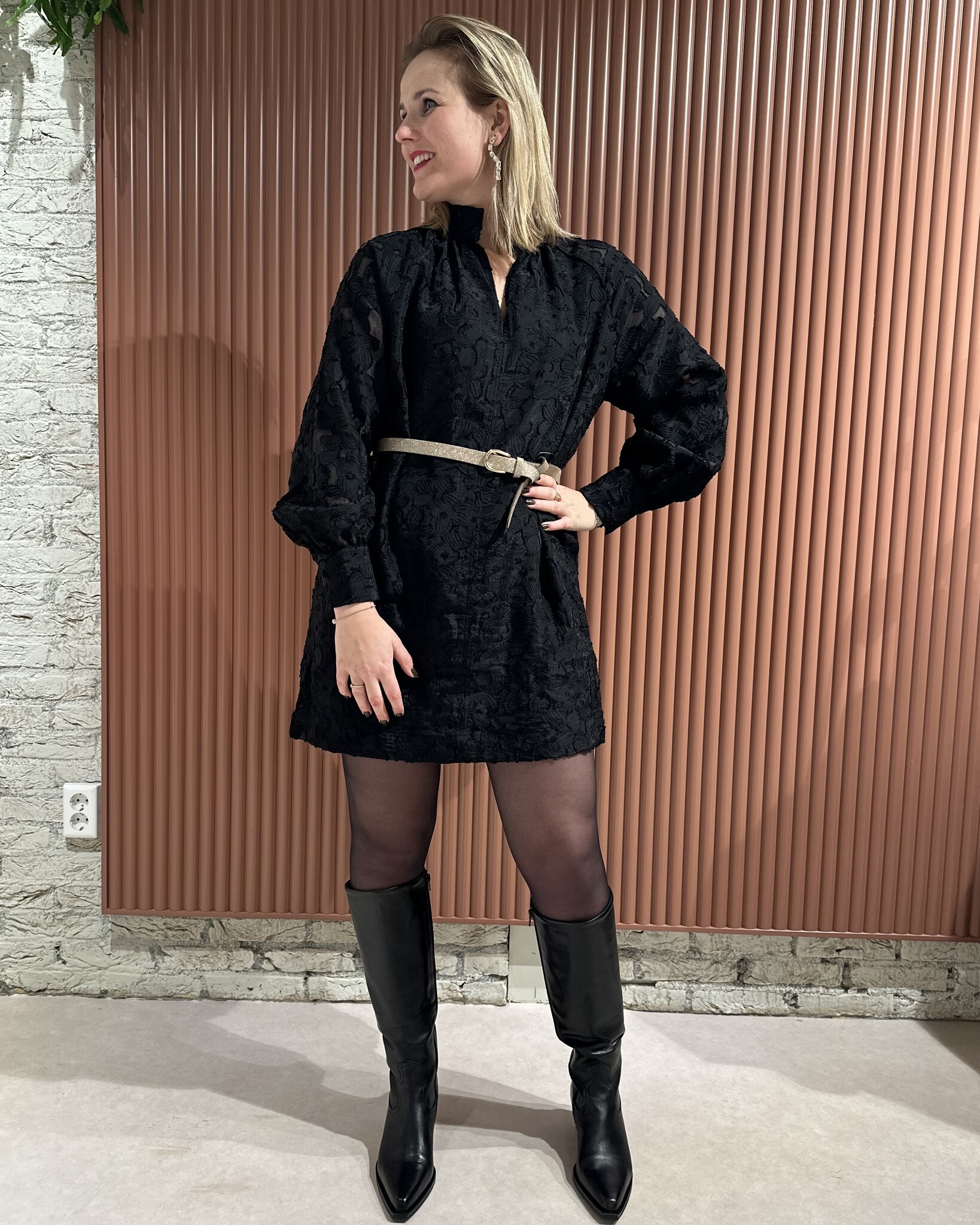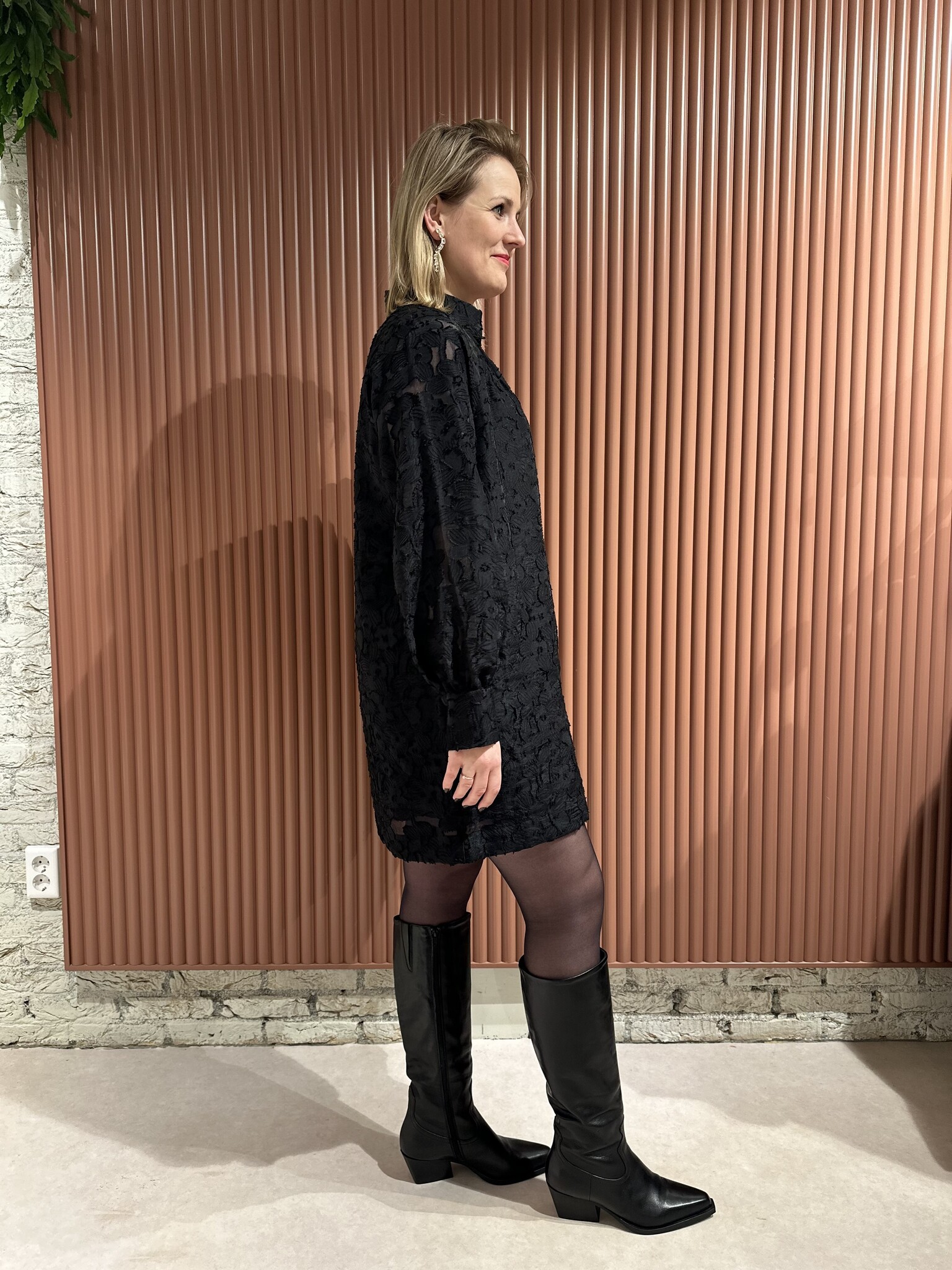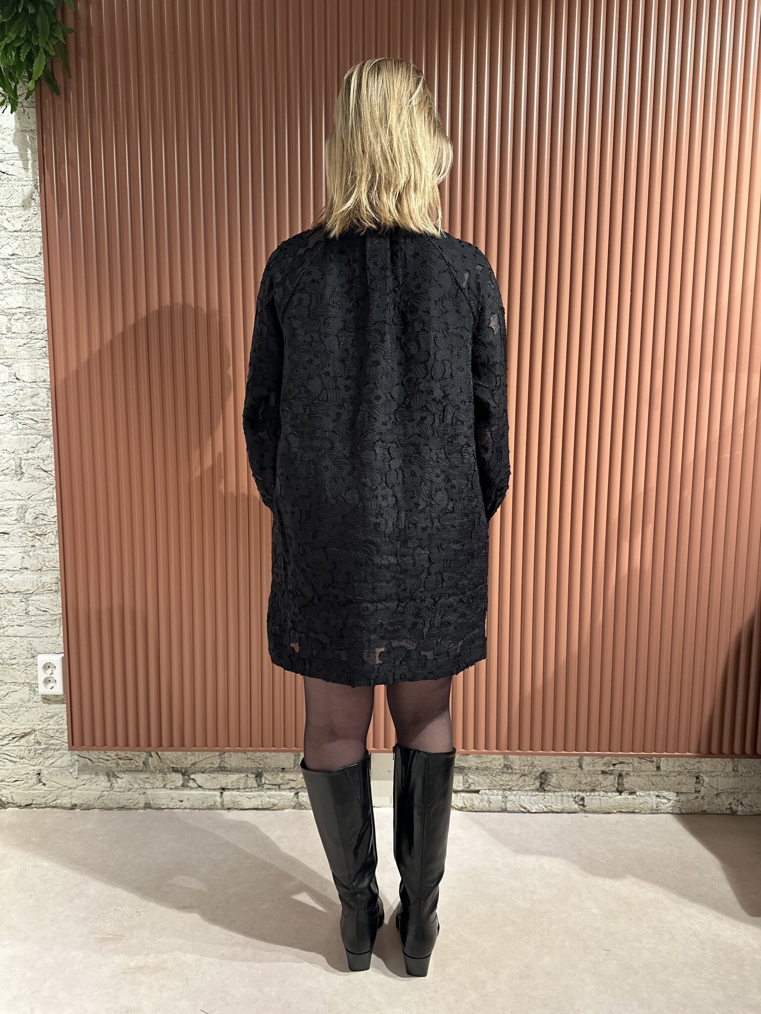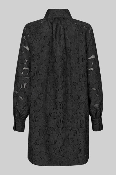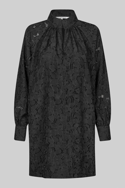 De Stary Dress - Black van Second Female is een zwarte jurk van bloemenkant. De jurk heeft bloemenkant op een doorschijnende tonale achtergrond en een hoge hals met open voorkant met knoop- en lussluiting aan de bovenkant met met stof beklede knopen. Verder beschikt deze jurk over twee steekzakken, raglanmouwen met knoopsluiting bij de manchetten en heeft een gevoerd lichaam. Het betreft een losse, rechte pasvorm.